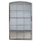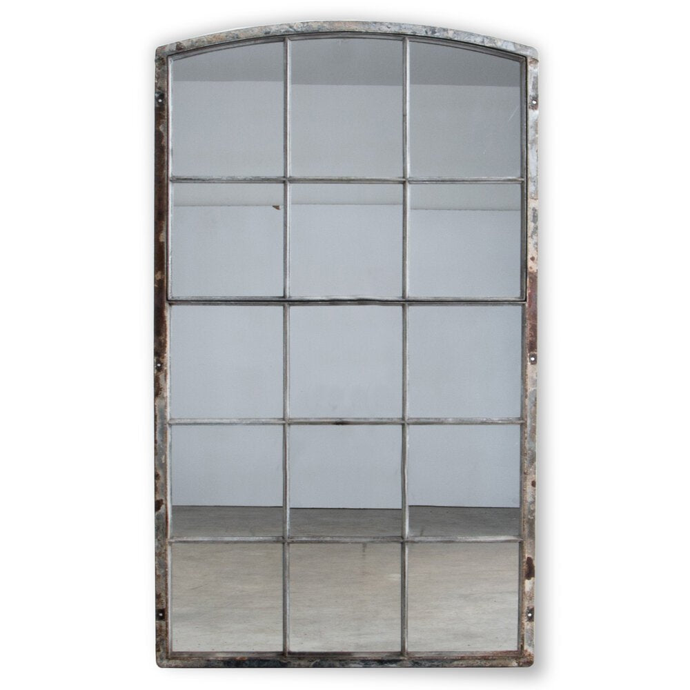 Vintage large church window with mirrored glass and original iron frame with beautiful aged patina.