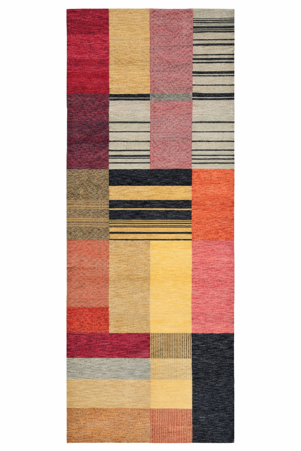Handcrafted in Nepal from 100% wool, this 3×10 patchwork runner features textured panels in warm, earthy hues. Rich color and weave variation add depth, creating an inviting foundation for hallways and transitional spaces.