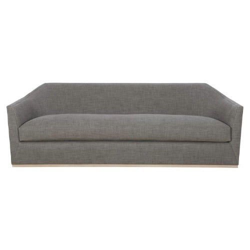The Amherst sofa has a refined structure marked by sharp, faceted lines that create a unique silhouette. Its precisely tailored upholstery, combined with a durable, solid white oak plinth base, adds to its exceptional craftsmanship.