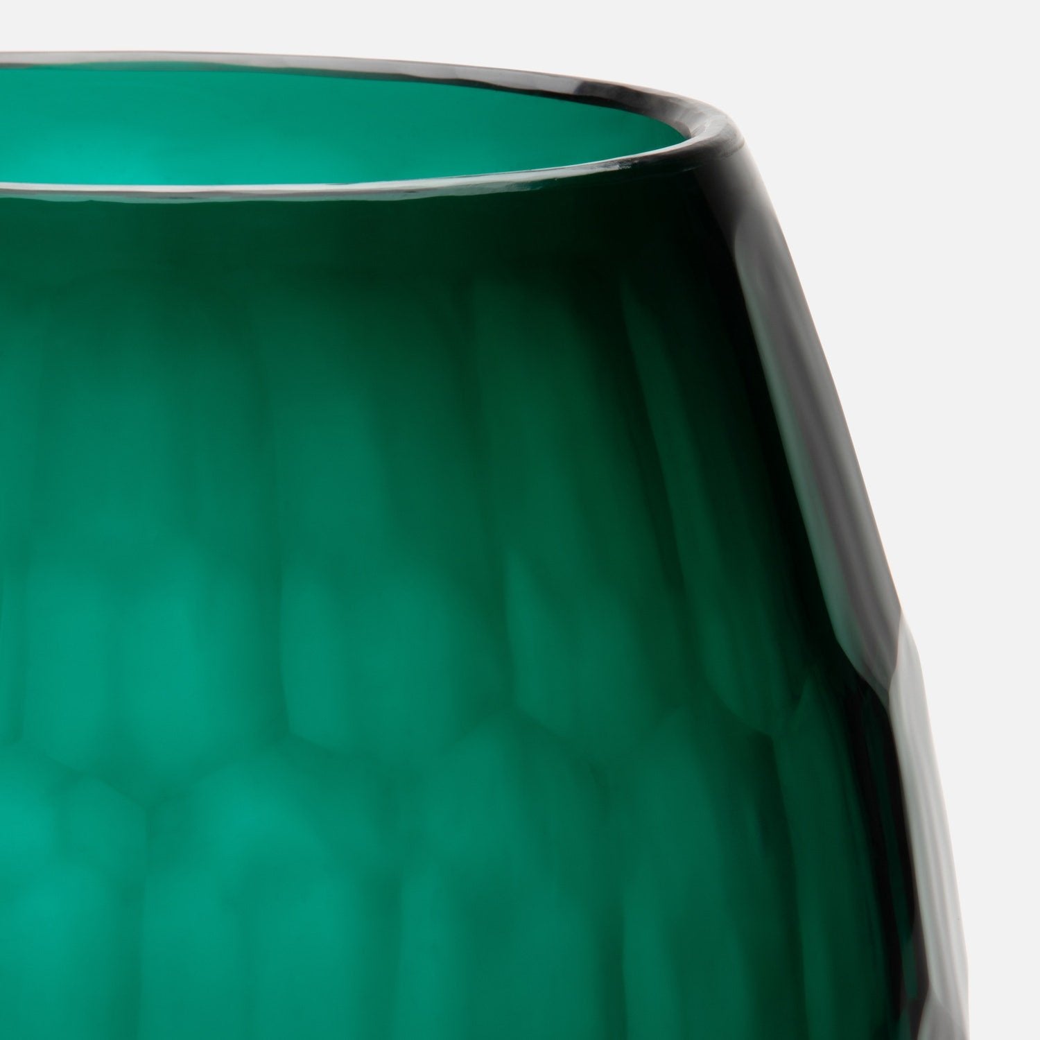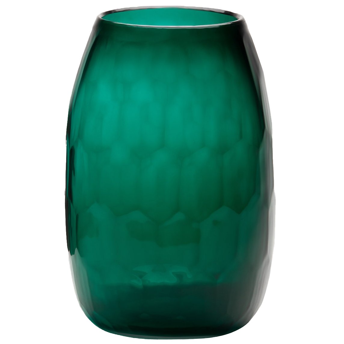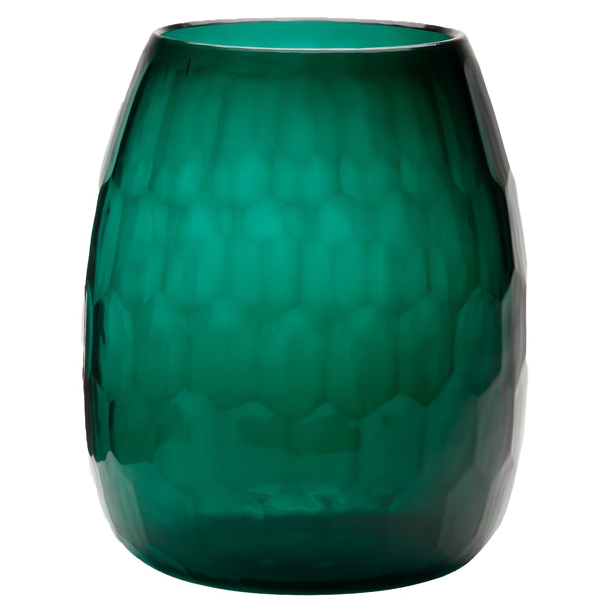 Emerald-green glass and a subtle, faceted, geometric pattern contribute to this sizable vase's simple yet commanding presence.