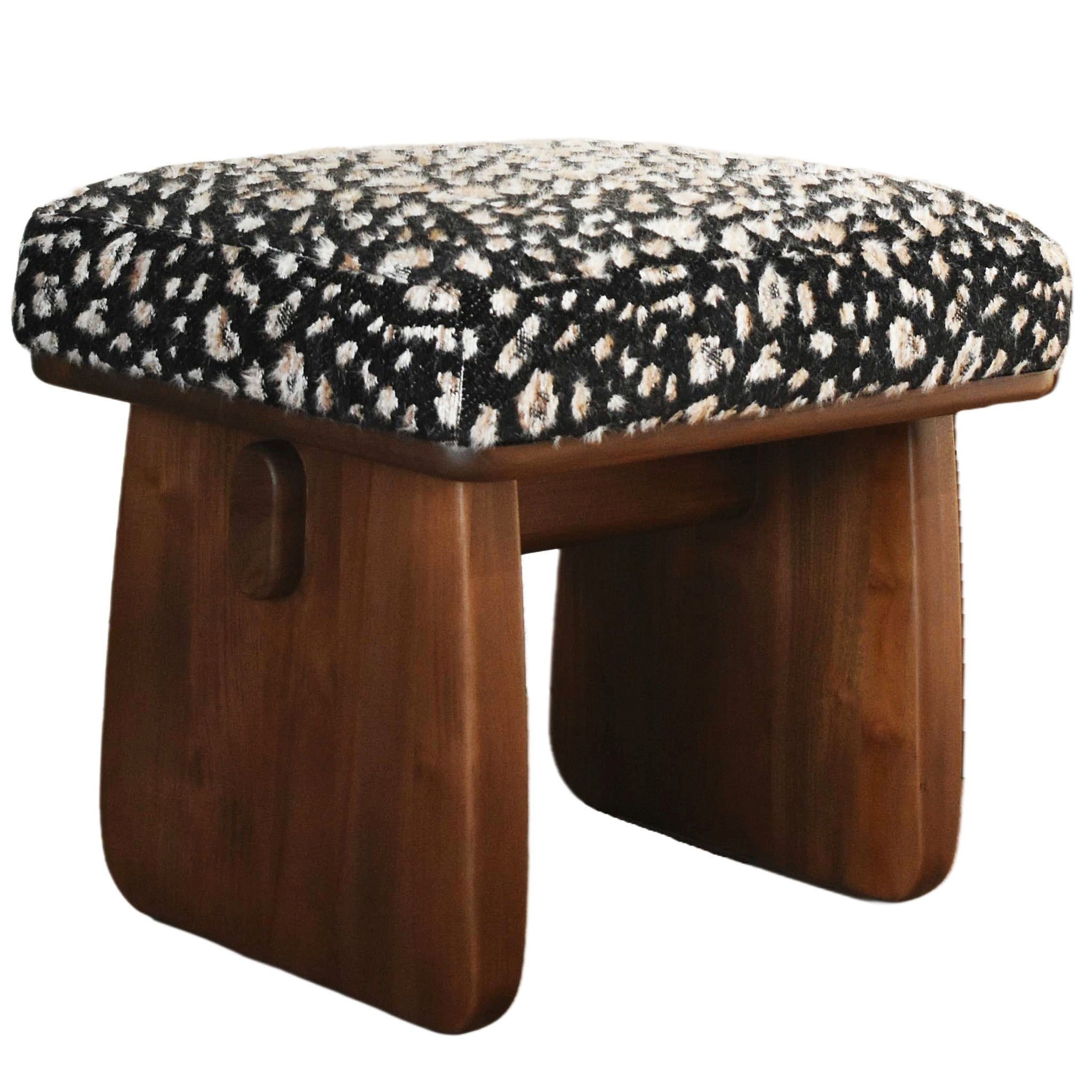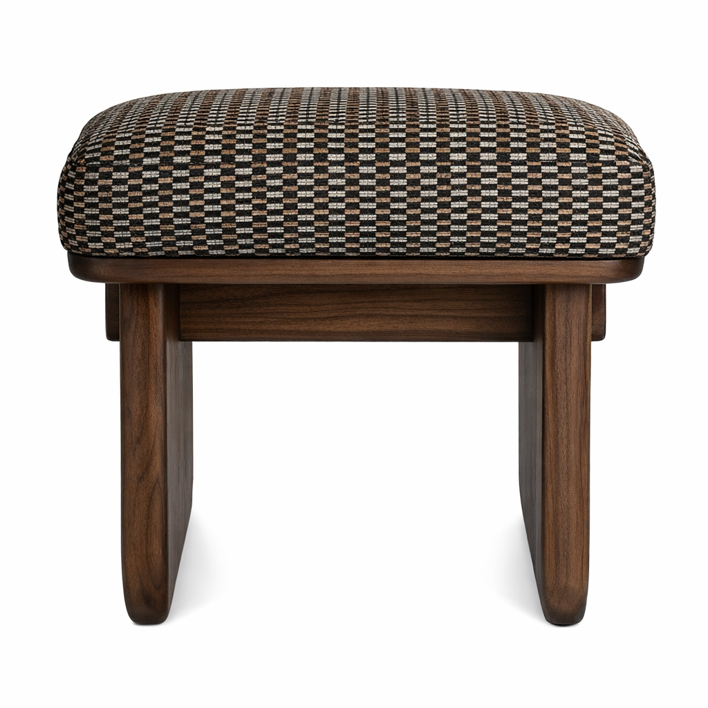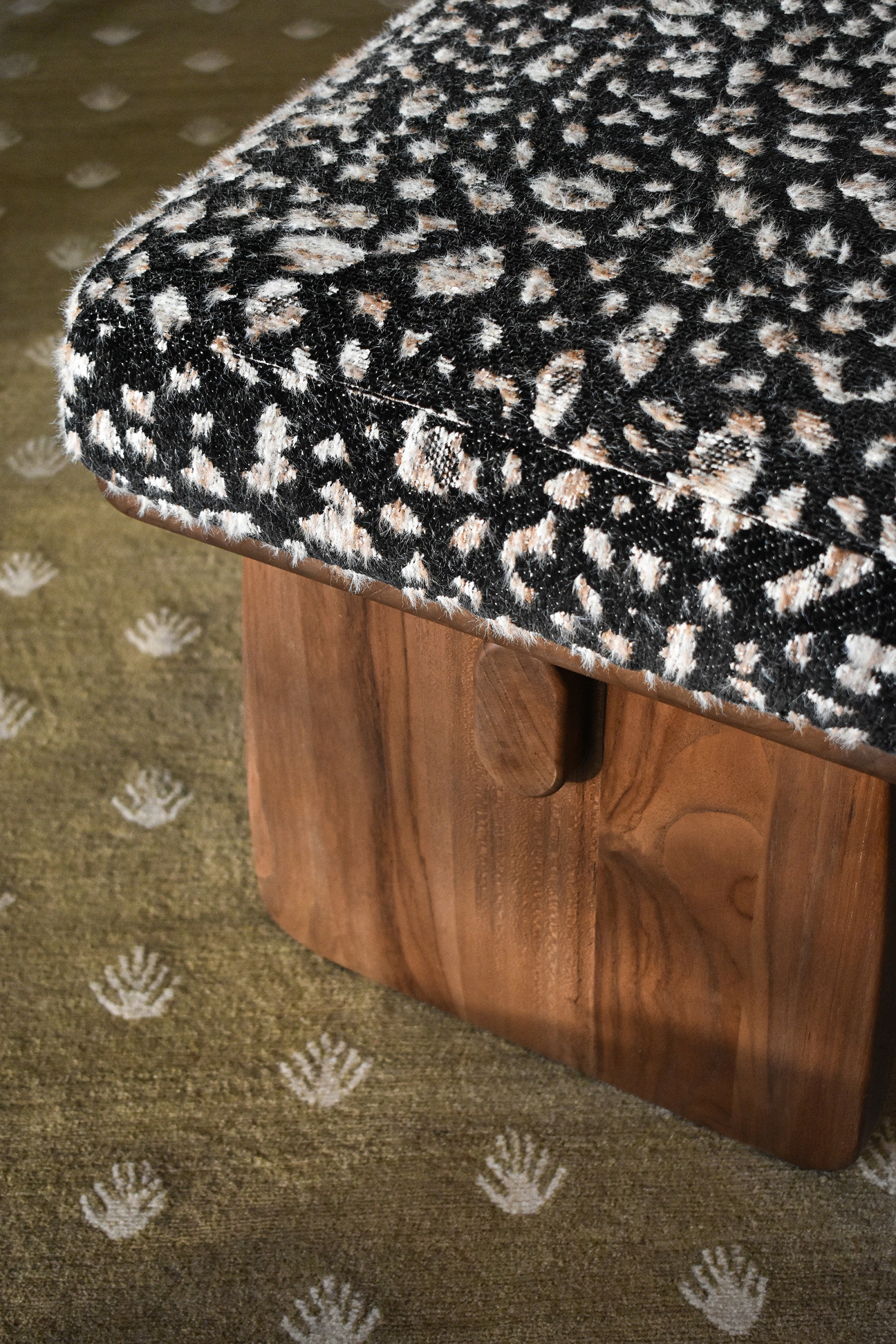An upholstered ottoman featuring a sculptural solid wood base and a generously cushioned top. Crafted from sustainably sourced solid teak with a light, natural finish, the base highlights the wood’s natural grain while providing architectural presence and sturdy support. Versatile, it functions effortlessly as both a footrest and occasional seating, making it a refined addition to modern and transitional spaces.
