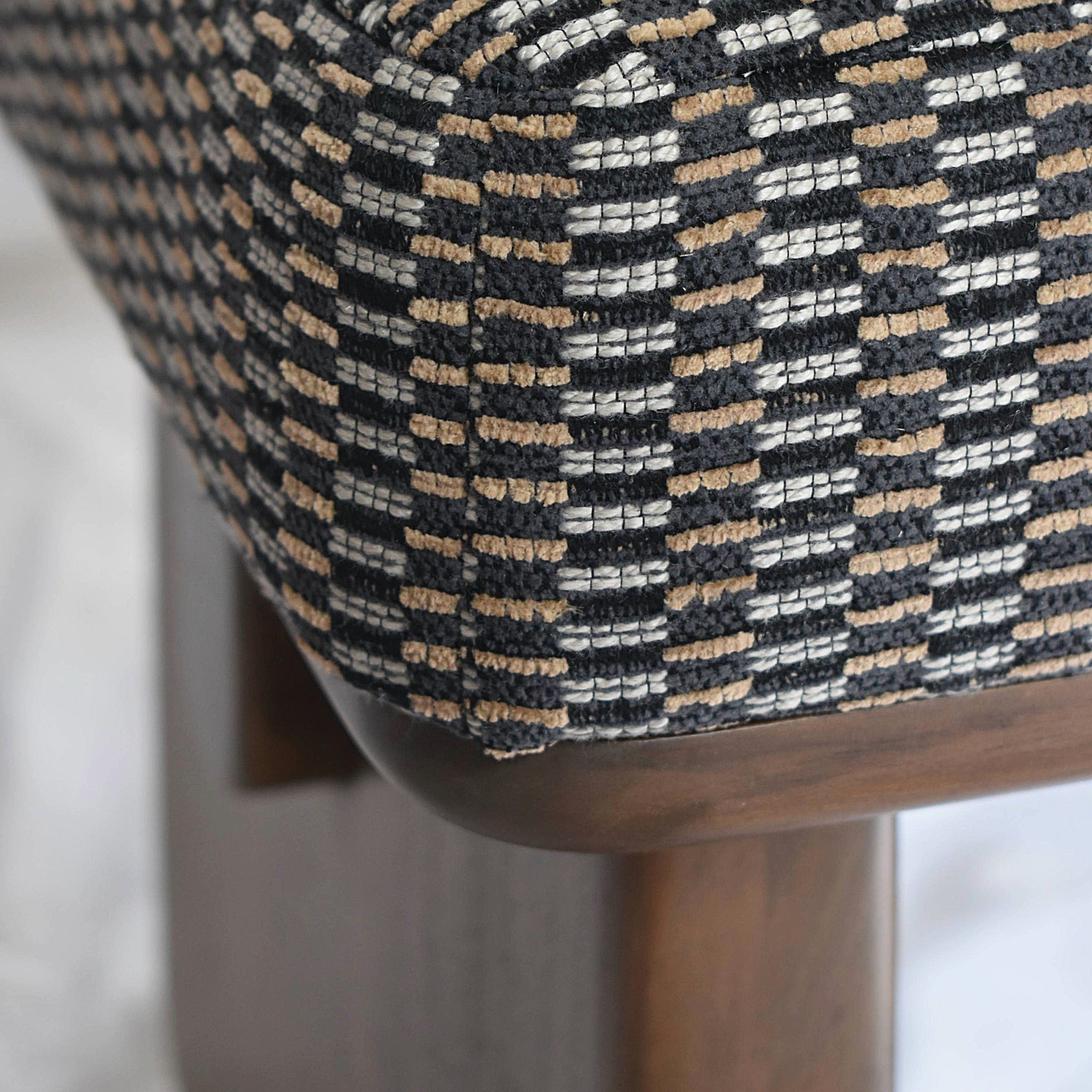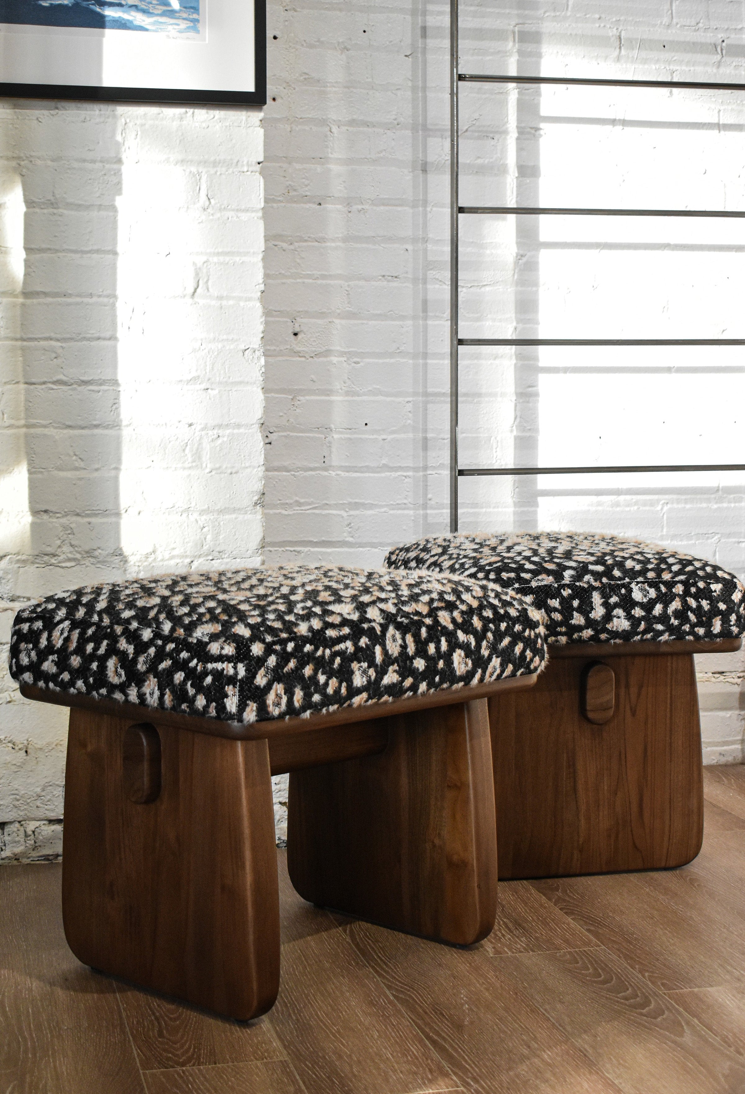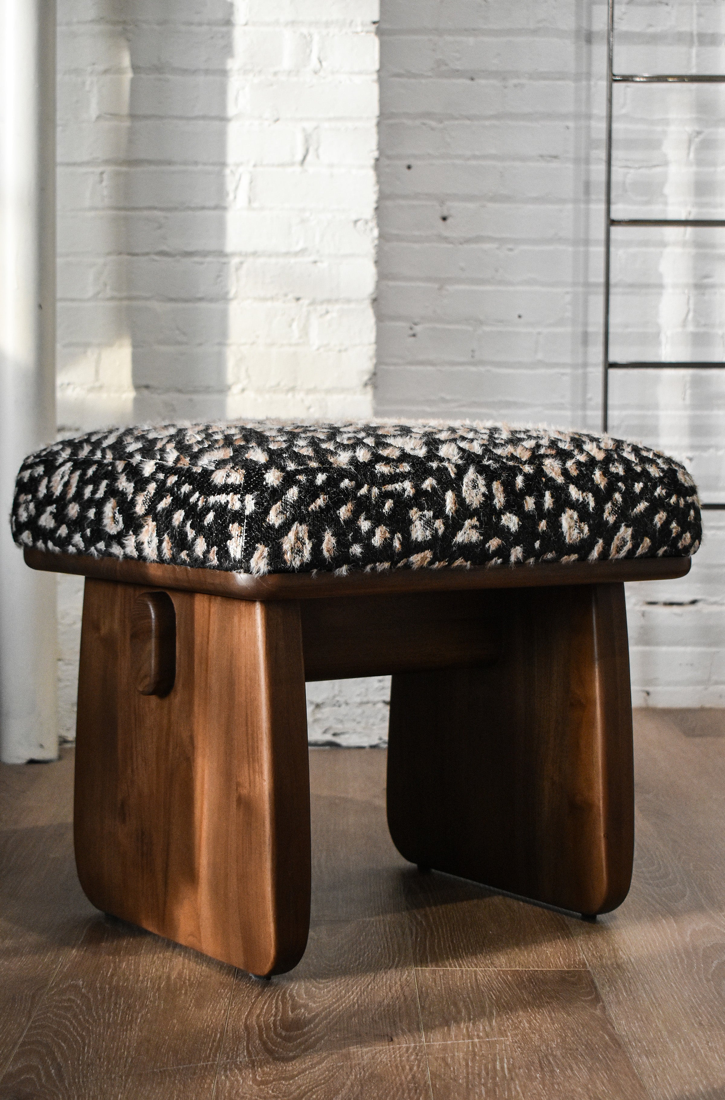 An upholstered ottoman featuring a sculptural solid wood base and a generously cushioned top. Crafted from sustainably sourced solid teak with a light, natural finish, the base highlights the wood’s natural grain while providing architectural presence and sturdy support. Versatile, it functions effortlessly as both a footrest and occasional seating, making it a refined addition to modern and transitional spaces.