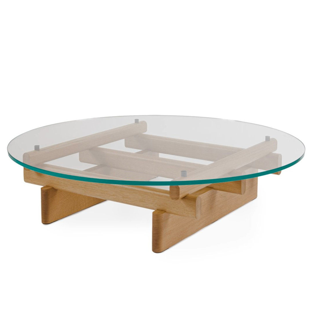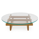This Asian-inspired coffee table blends oak and glass in a harmonious fusion of materials. Its structured base, inspired by the ritual reconstruction of Japanese shrines, features interwoven oval beams. Topped with extra-clear glass, it’s a statement of elegance and modernity.