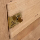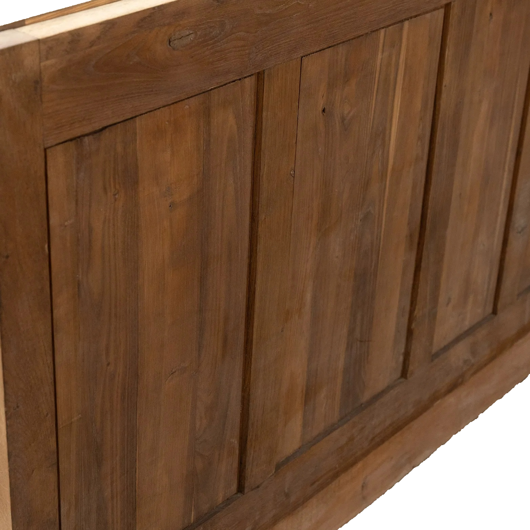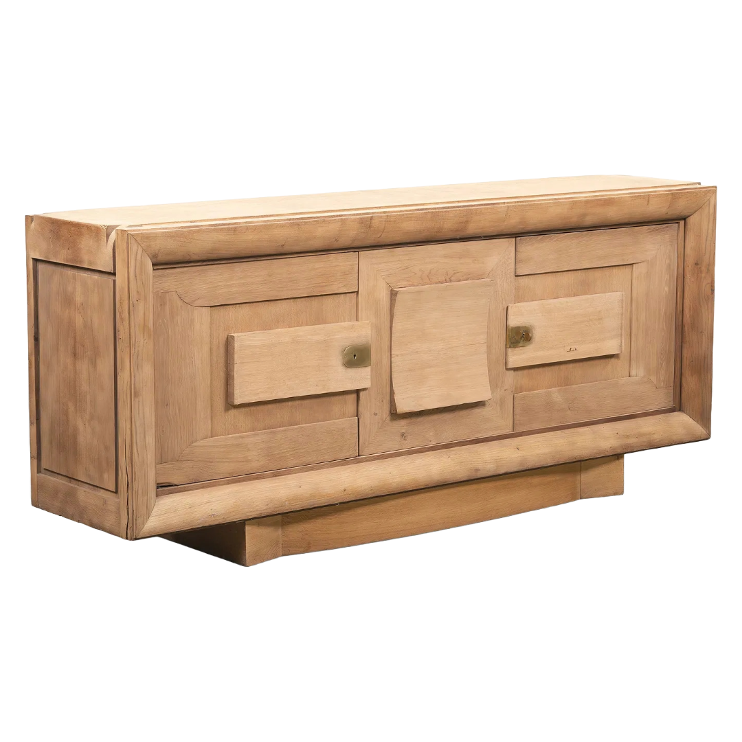 A French oak sideboard with striking architectural lines and sculptural door panels in the style of Charles Dudouyt. Raised on a recessed plinth base, its symmetrical design adds visual interest while offering practical storage.