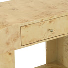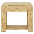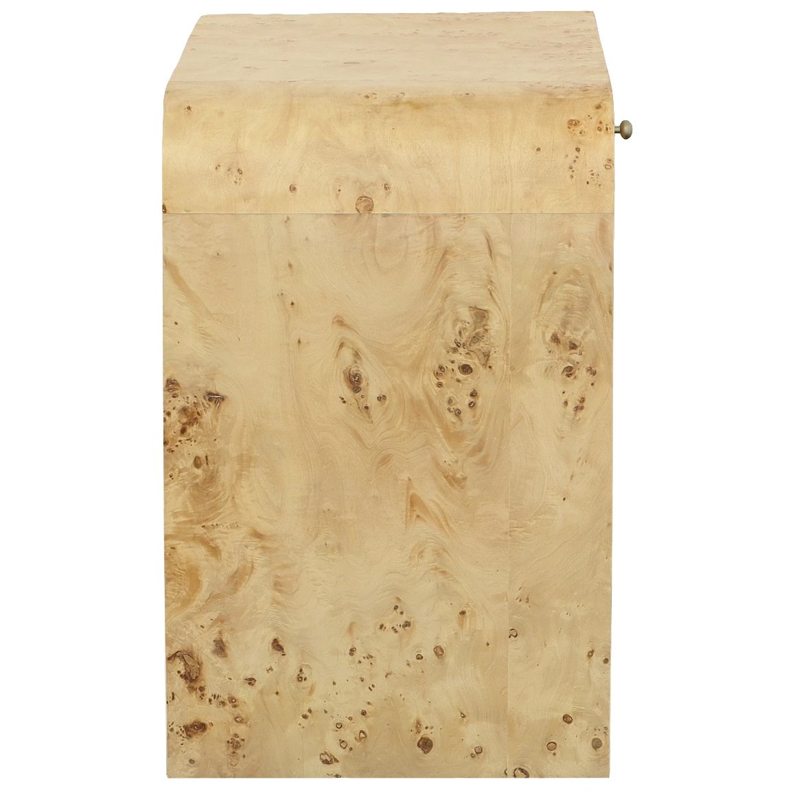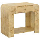 The nightstands are beautifully textured with mappa burl, a highly decorative veneer in light brown peppered by an unusual darker, bark-like pattern of tight clusters. As mappa burl is a natural product from individual trees, each cut of veneer will vary slightly. The design is elevated with a curved edge, a drawer for personal use, and a shelf to hold a stack of books.