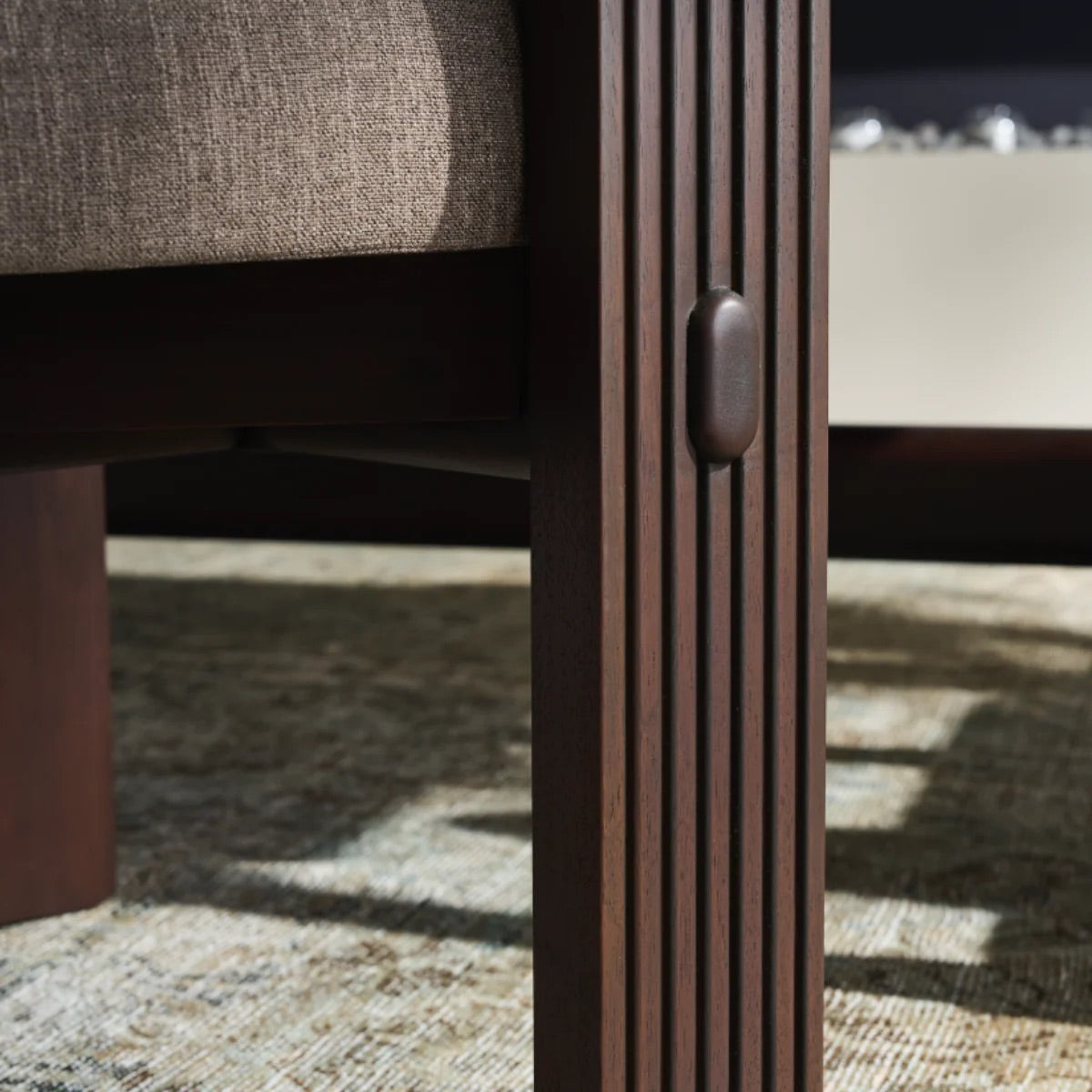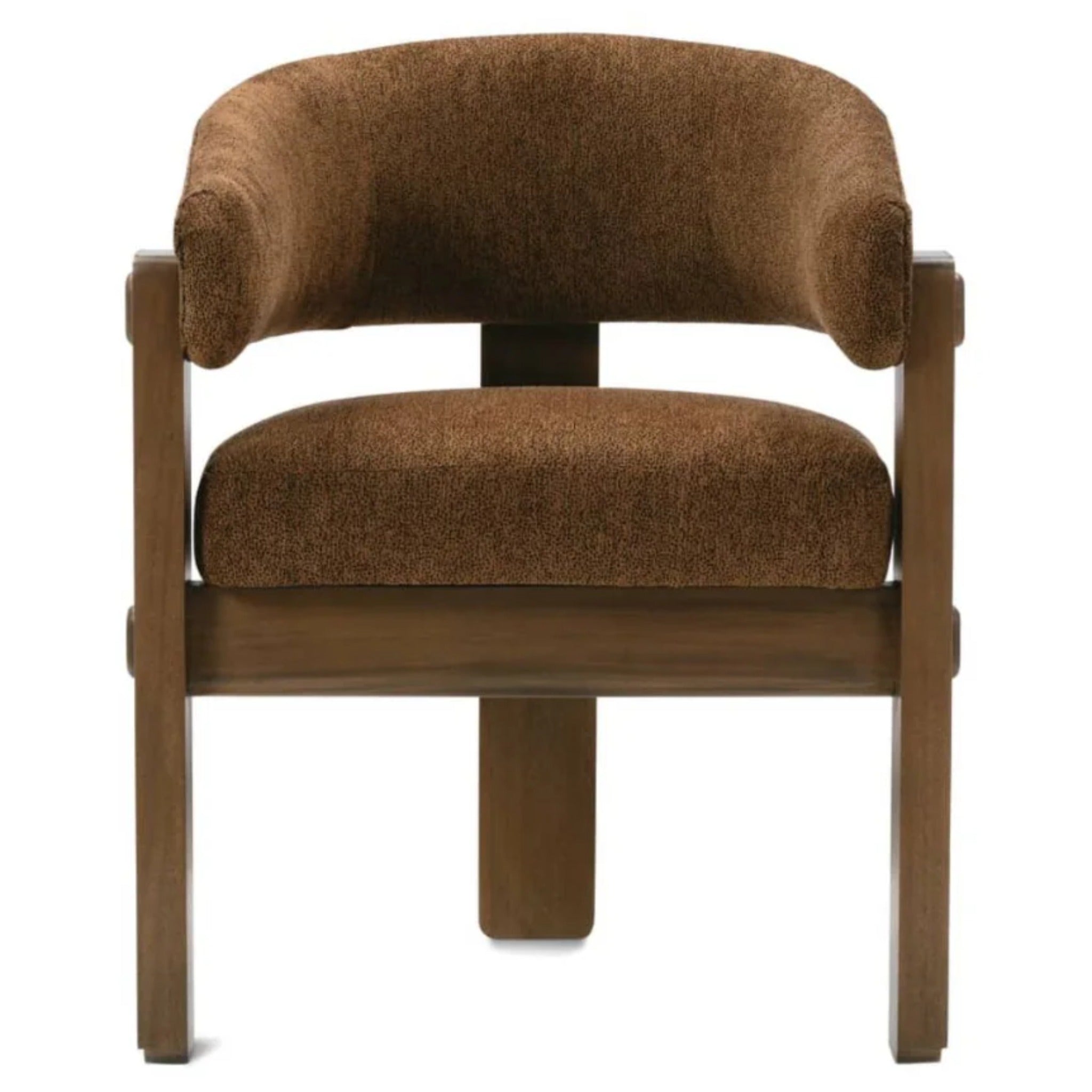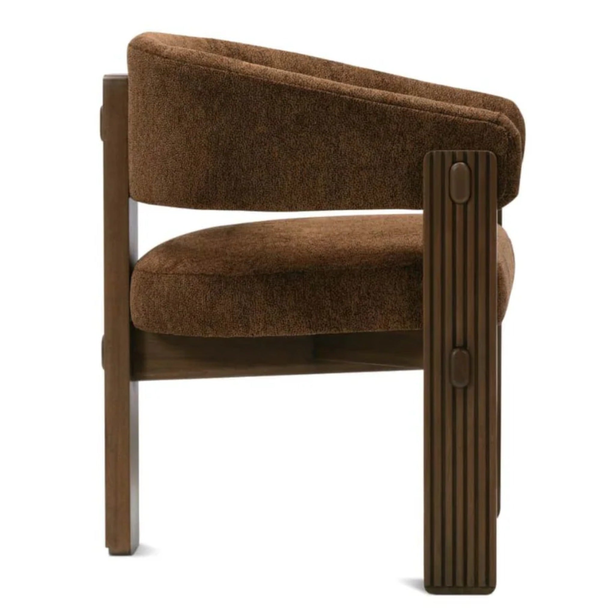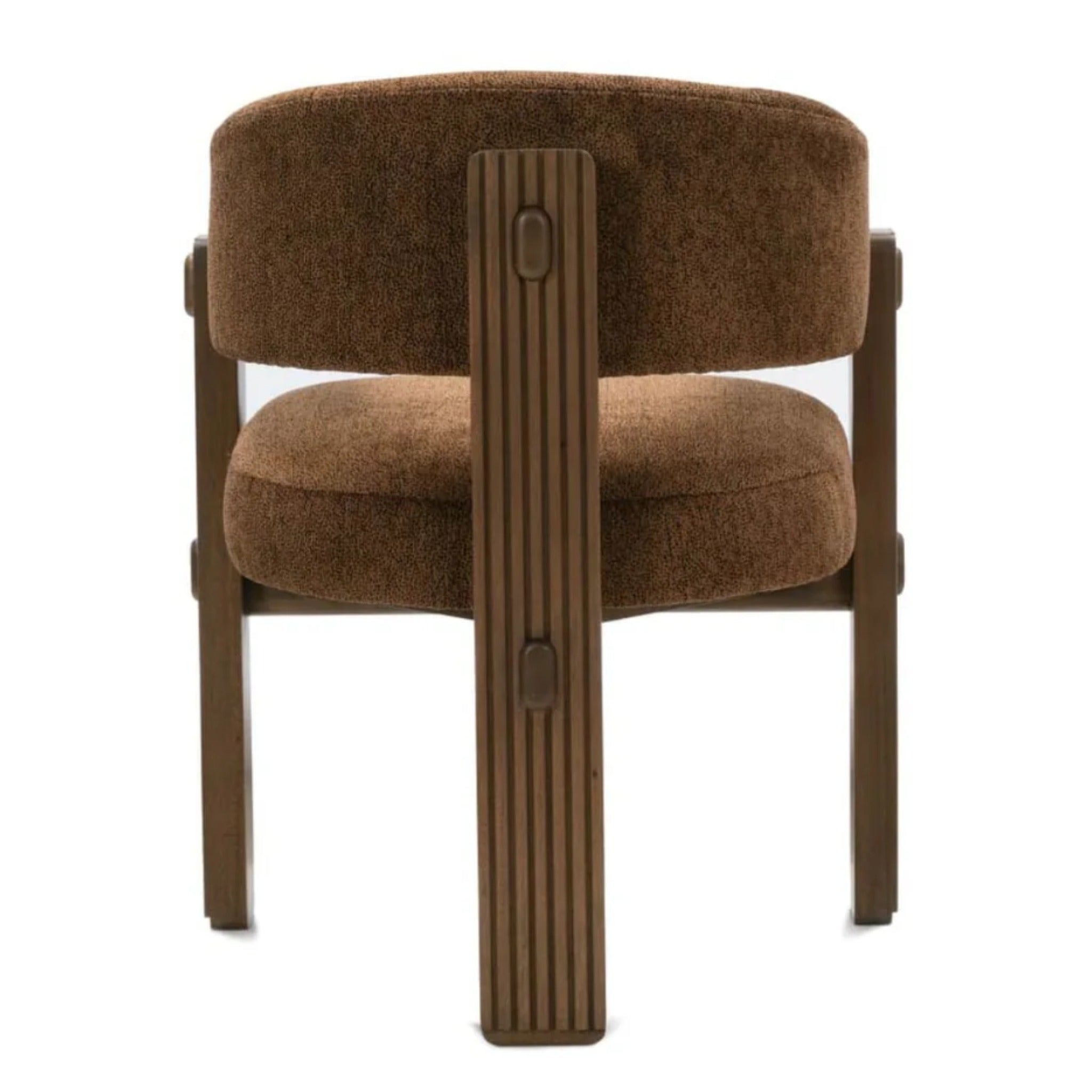 This dining chair masterfully balances architectural strength with graceful curves, featuring a sophisticated curved back wrapped in sumptuous upholstery that beckons you to settle in and linger over long conversations. Its distinctive reeded solid mahogany frame, available in rich Godiva or lighter Sesame finishes, showcases meticulous craftsmanship through artfully carved vertical channels and detailed bottom trim work, adding visual intrigue from every angle. The chair's barrel-style back design creates an intimate dining experience while maintaining an open, airy presence that works beautifully in both classic formal dining rooms and contemporary open-concept spaces.