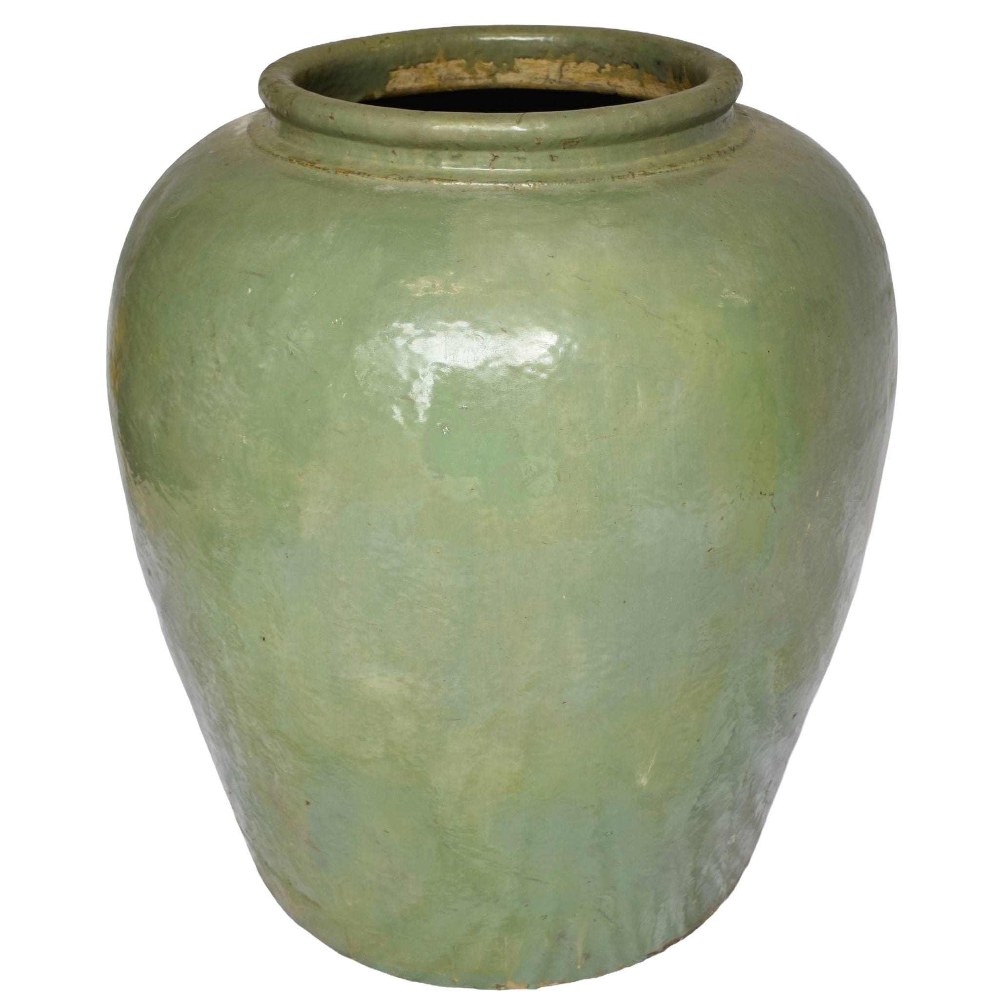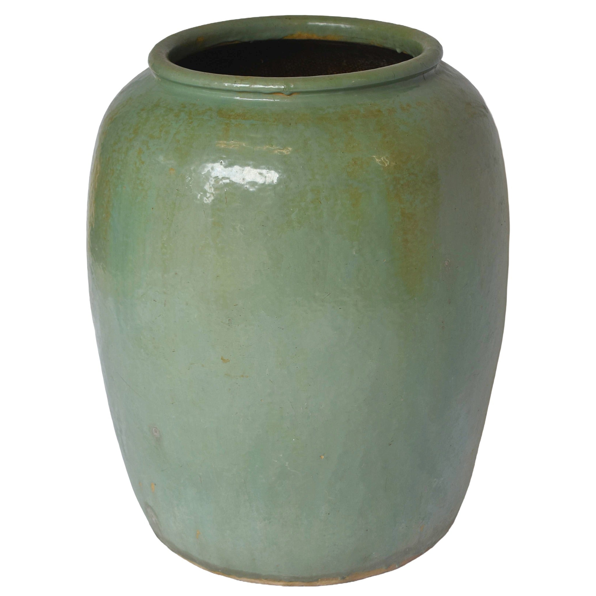 Oversized antique celadon-glazed vessel with graceful tapering lines and a smooth jade-green finish. Its rich patina reflects age and history, characteristic of classic Chinese design. Once used for storage, it now serves beautifully as a decorative planter for small trees or large ferns.