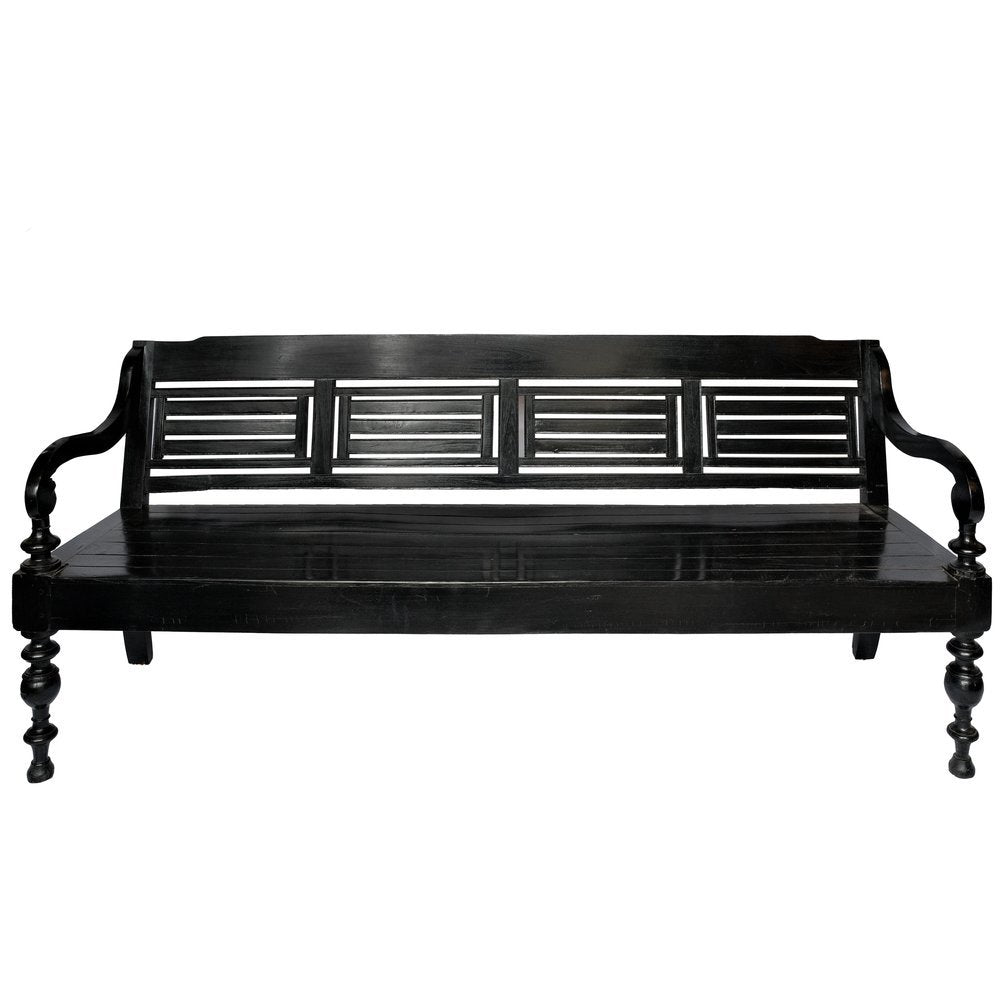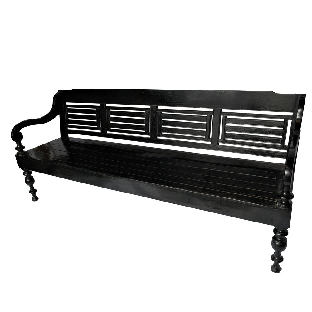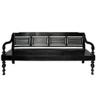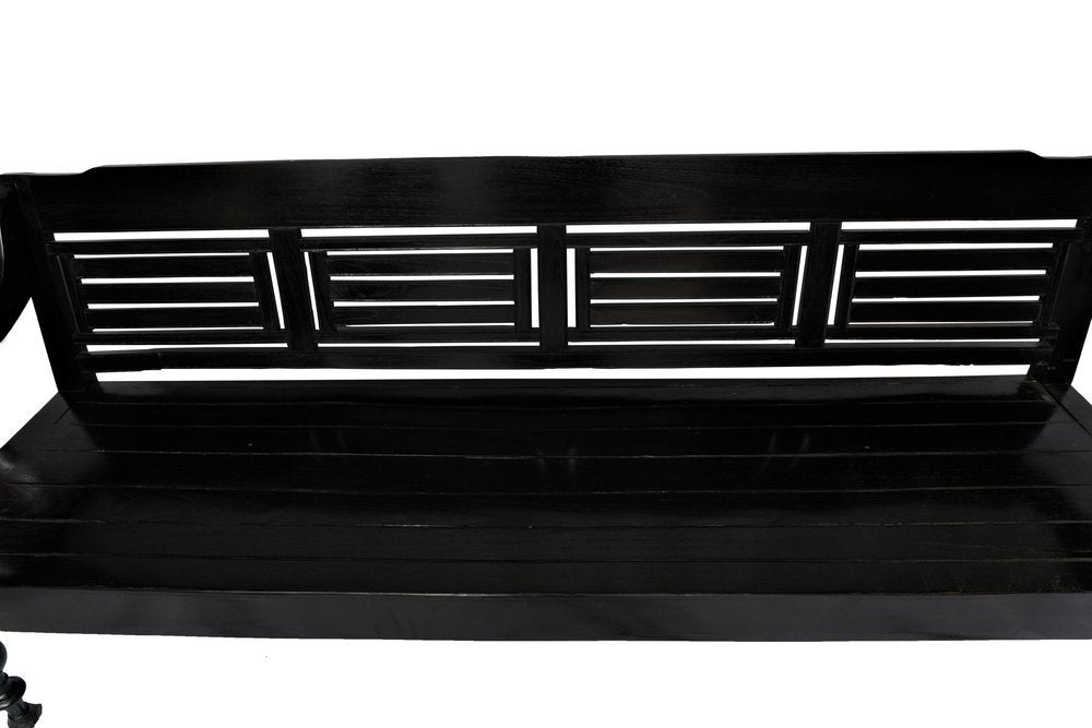 Long solid black wooden bench with rounded legs and curved arms with a striking linear slotted back pattern.