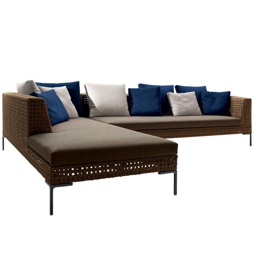 The Charles sofa system, a long-time bestseller B&B Italia, is being introduced in an outdoor version: Charles Outdoor. Characteristics that made it a classic of pure contemporary taste have been left unchanged. The system will have the same slim frame, flexibility, and signature design of the inverted “L” shape aluminum foot. The new piece maintains the beauty and simplicity of the original project while also evolving gracefully for practical outdoor use the piece is lightweight thanks to its slim aluminum frame and has an external surface created by open interlacing brown polypropylene ribbon. Available in many sofa & sectional configurations.