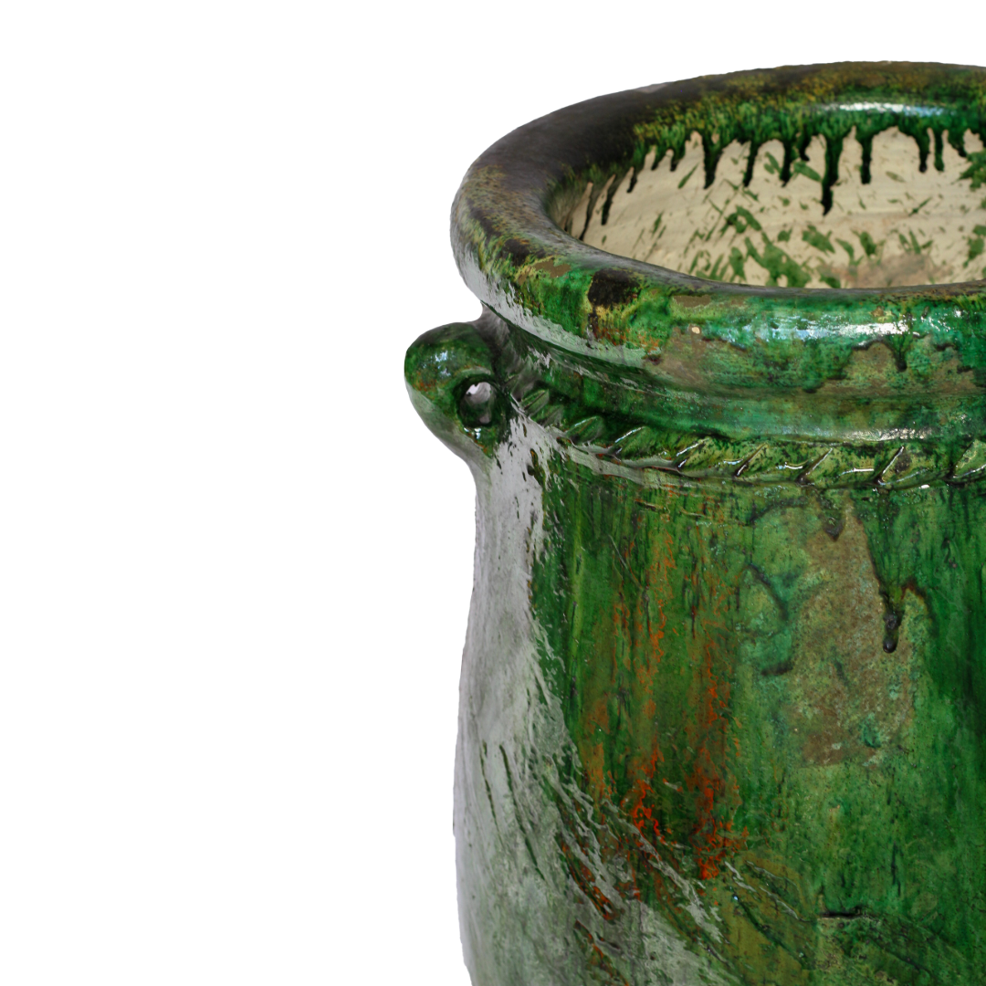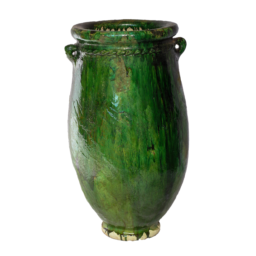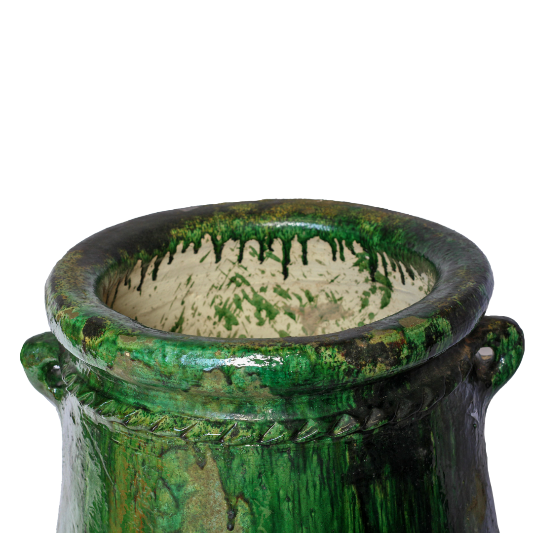 This stunning sculptural green-glazed ceramic vase is a testament to Moroccan artistry, handcrafted using age-old techniques passed down through generations. Its deep, lustrous glaze and organic form highlight the beauty of traditional craftsmanship.