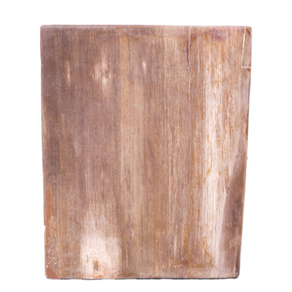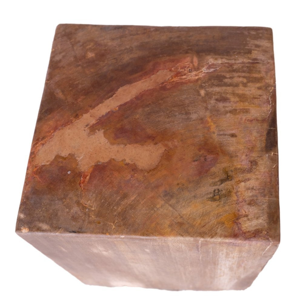 Square polished petrified wood stump with red and brown marbling with golden and cream grain.