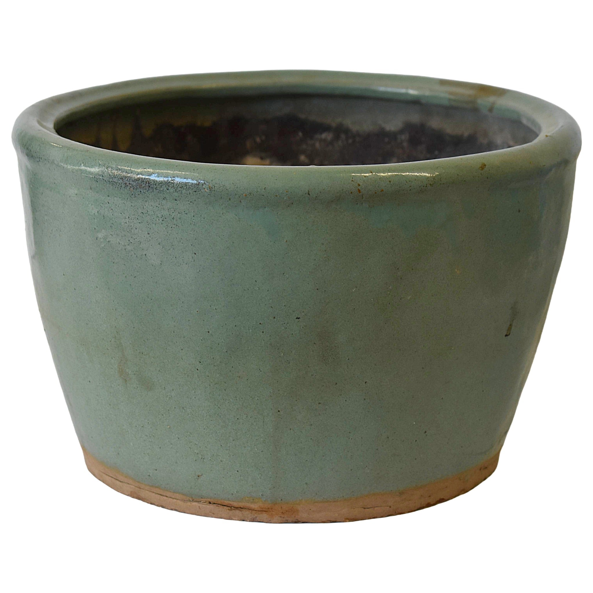A soft celadon-green glaze settles beautifully along this pot’s tapered form, wide mouth, rounded rim, and subtle raised grooves. This vintage Chinese low planter is well-suited for adding vibrant flowers or lush greenery to a garden or sunroom.