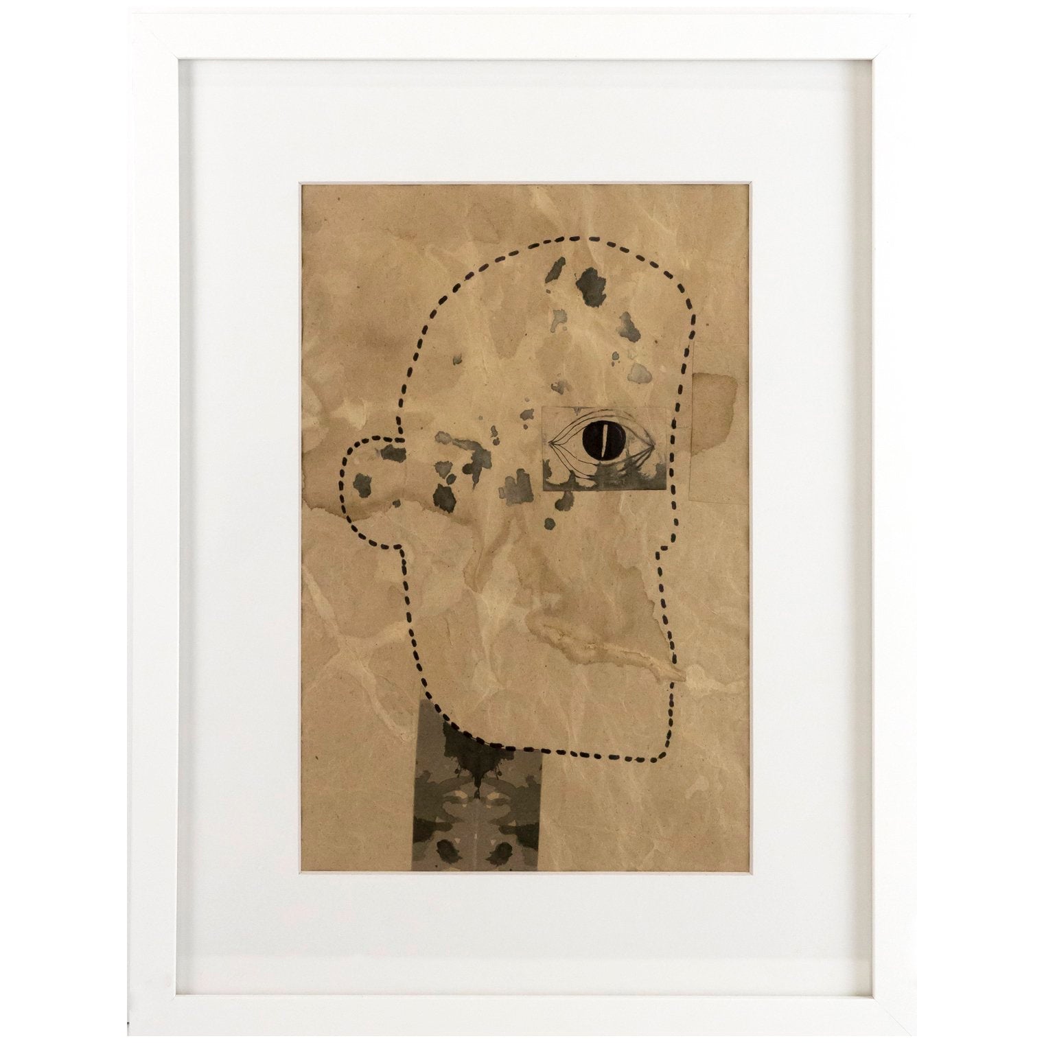 Darrell Dean's artwork is handmade and unique one-of-a-kind on brown paper using pen, ink, paint, pencil, coffee, bleach and other natural elements with various techniques including drawing, painting, staining, and collage. Each artwork is matted and framed in a white wood frame with glass.