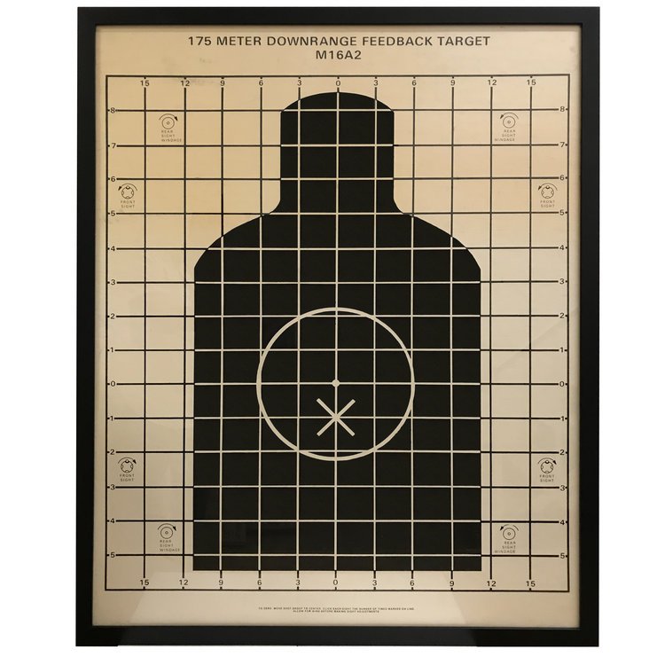 Very graphic and highly stylized vintage target poster framed in a new thick black matte frame.