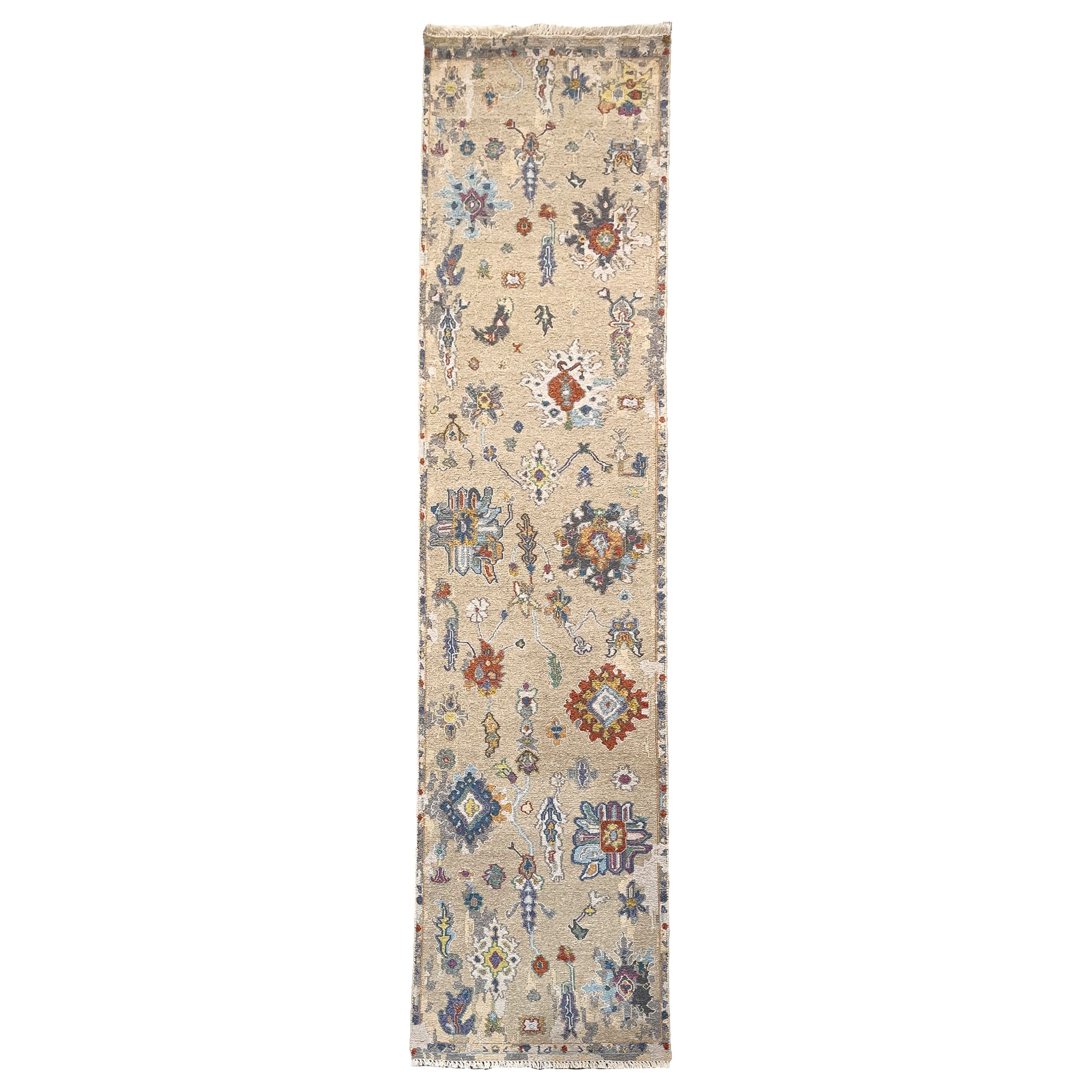 A traditional Soumak that incorporates classic patterns, designs, and colors ranging from tone-on-tone neutrals layered with intricate details of indigo blue and terracotta. Carefully Hand-knotted using fine hand-spun wool yarns in a special Turkish knot style.