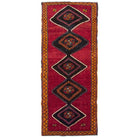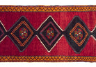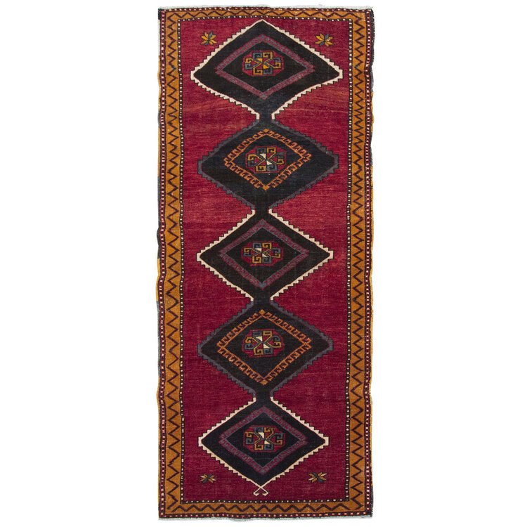 Vintage Oushak handmade runner featuring a regal red and gold motif with a central diamond pattern.