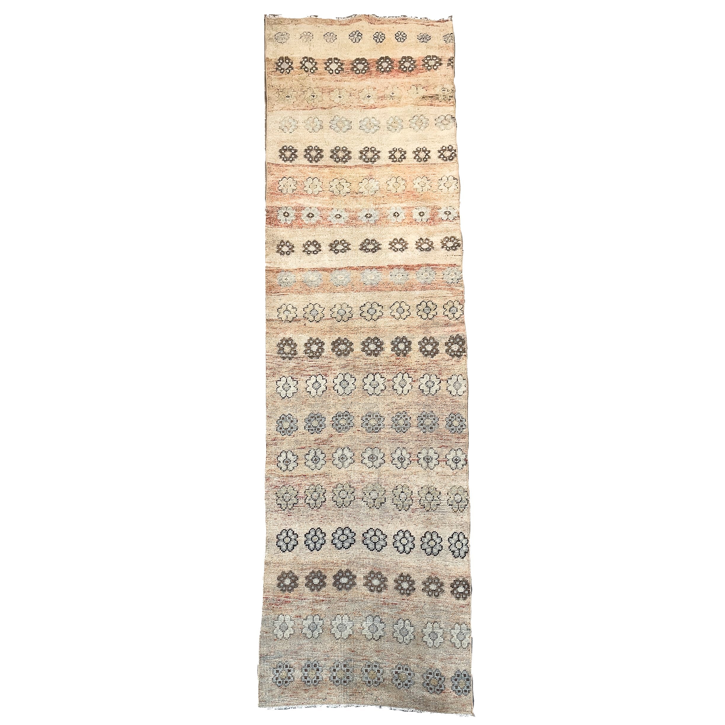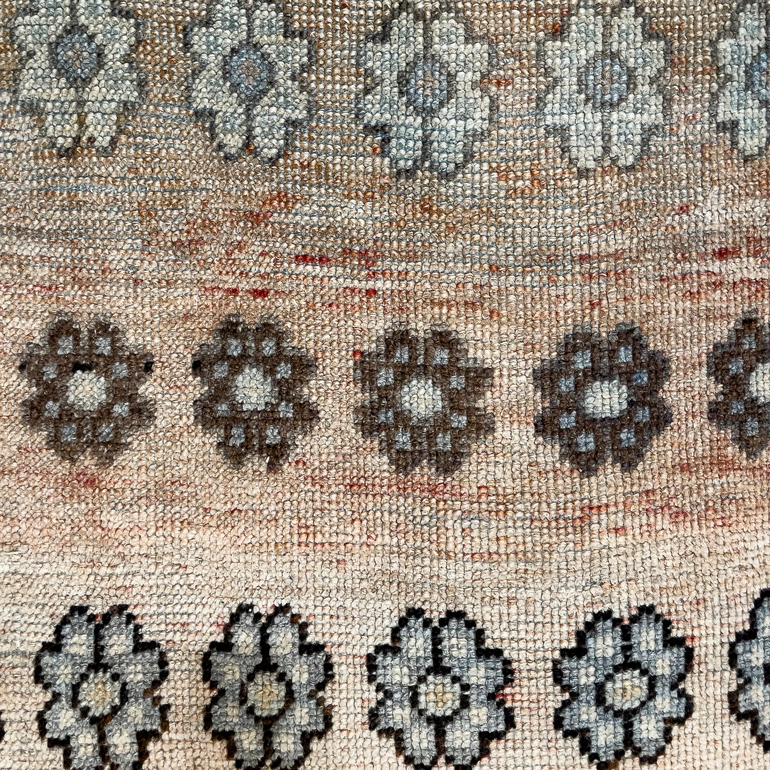 This hand-knotted Khotan rug features a beautiful linear floral design upon a faded rose background.