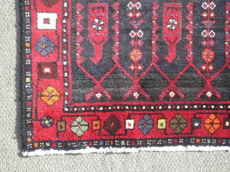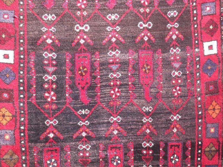 Simply beautiful handmade semi antique Persian Kolyaee runner. Made of fine quality natural vegetable dyed wool. This beautiful runner incorporates an all over tribal motif on an abrash black background and an intricately multi layered floral border. Hand woven in Kolyaee, Iran. The approximate year of origin: 1975-1985"