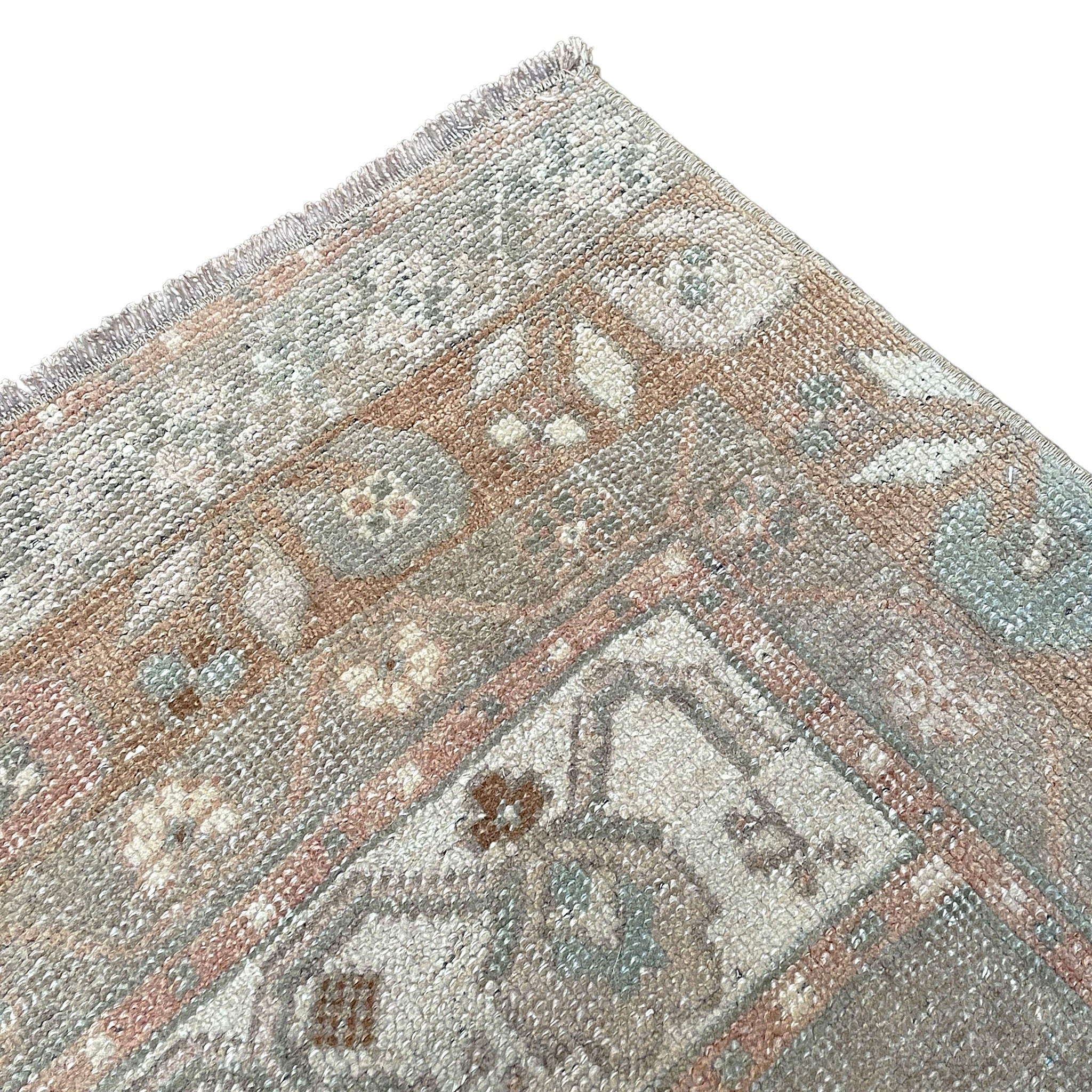 This vintage rug features a soft, timeworn palette of dusty blush, pale sky blue, and warm ivory for a beautifully faded look. A centered medallion design anchors the piece, framed by delicate floral details and a gently worn border. With its muted tones and relaxed patina, it adds an airy, collected feel, bringing character to a hallway, entry, or kitchen.