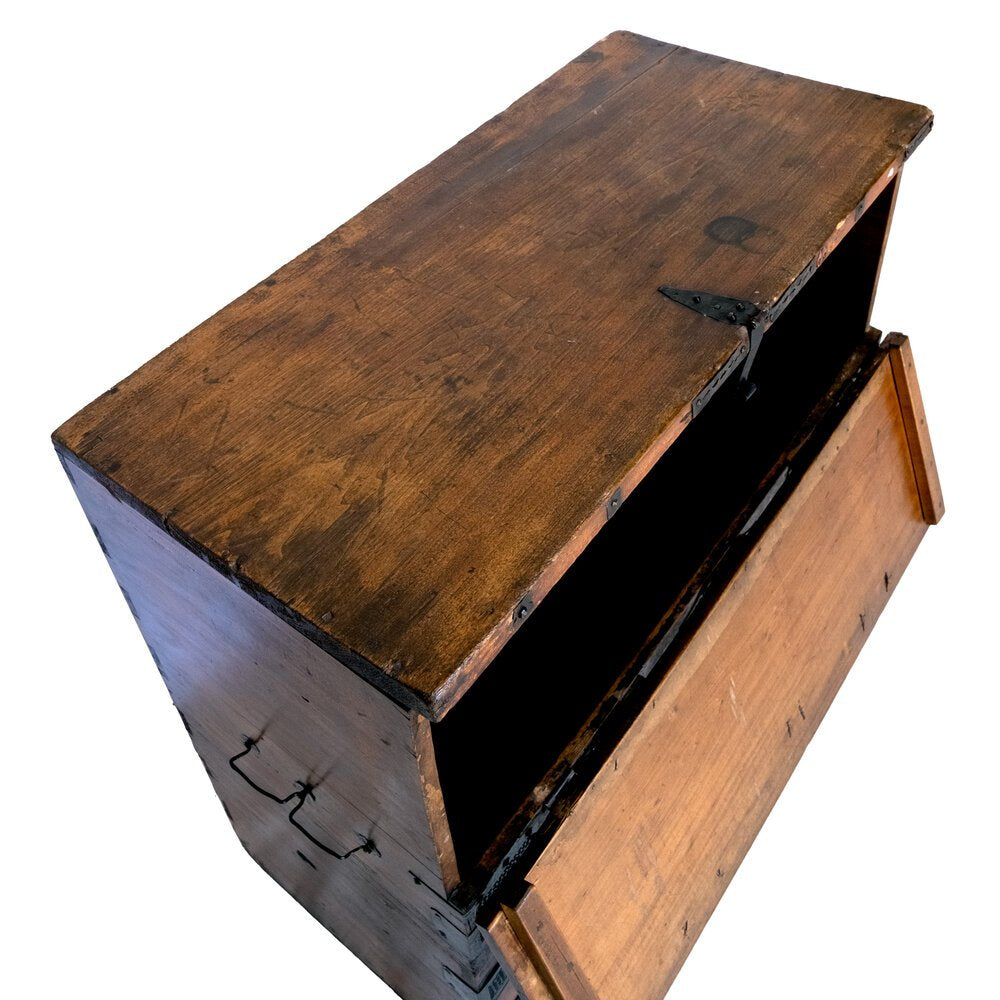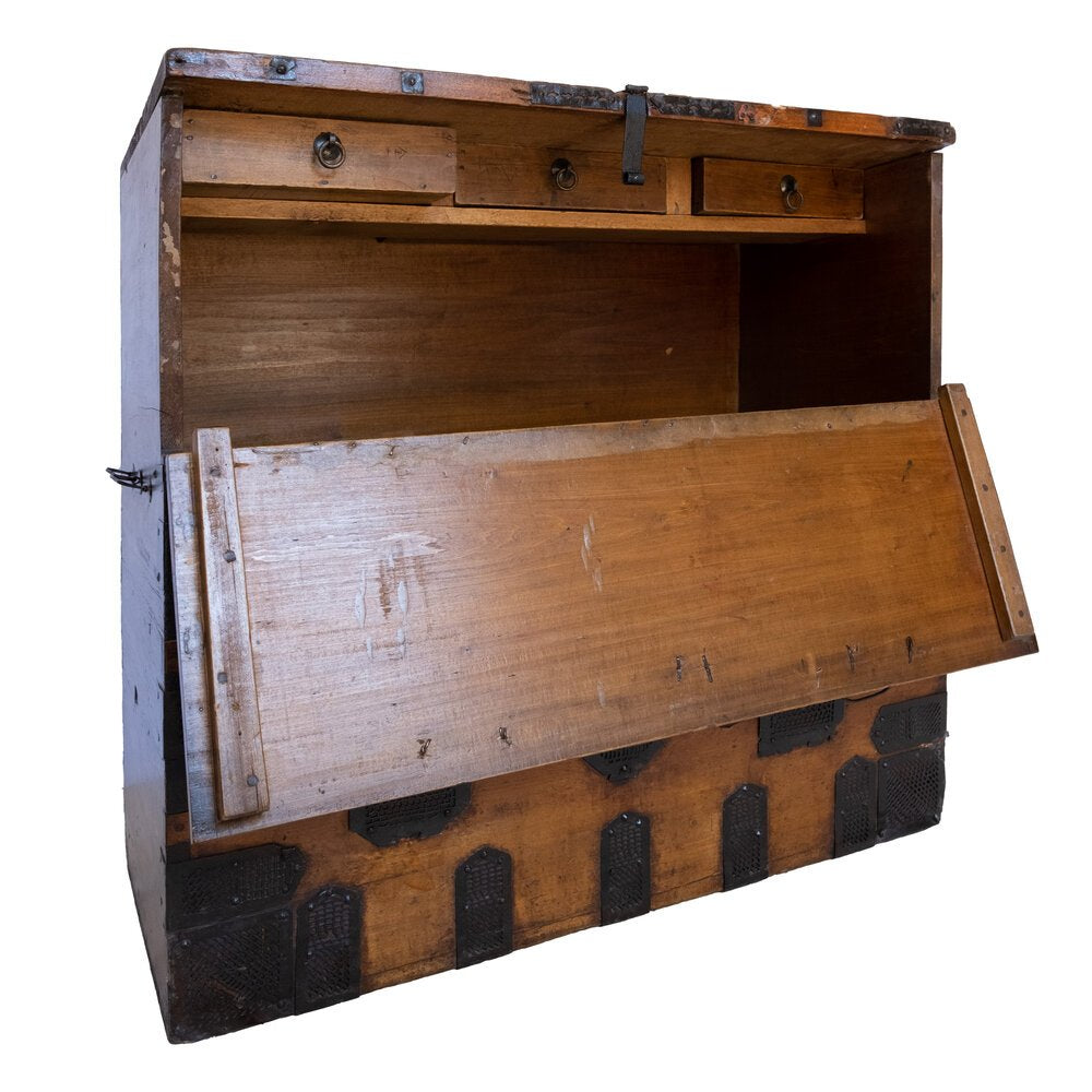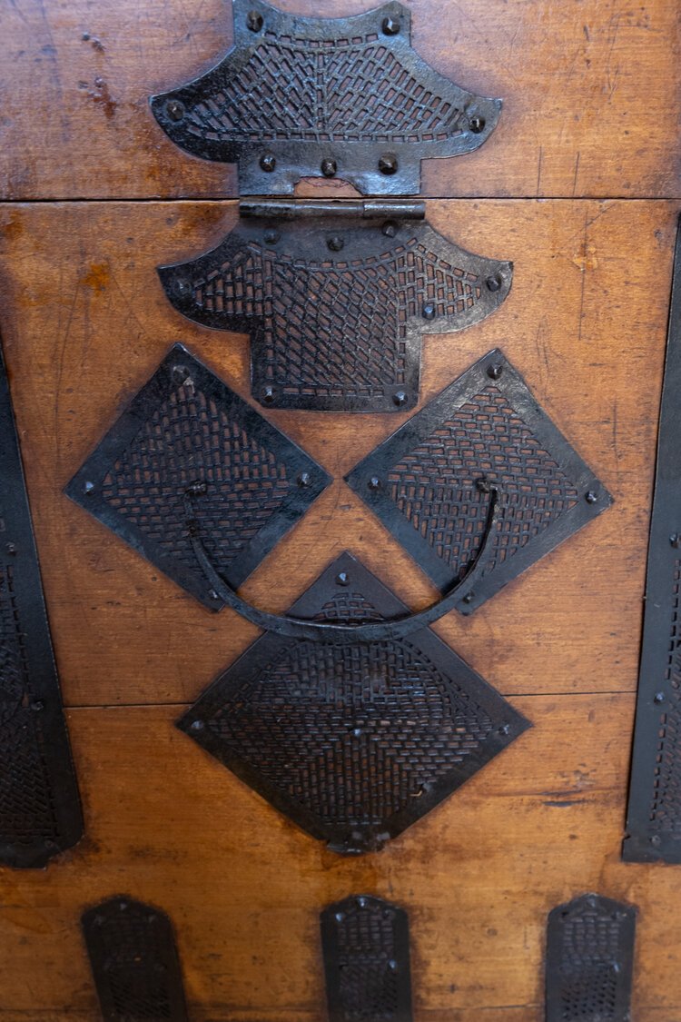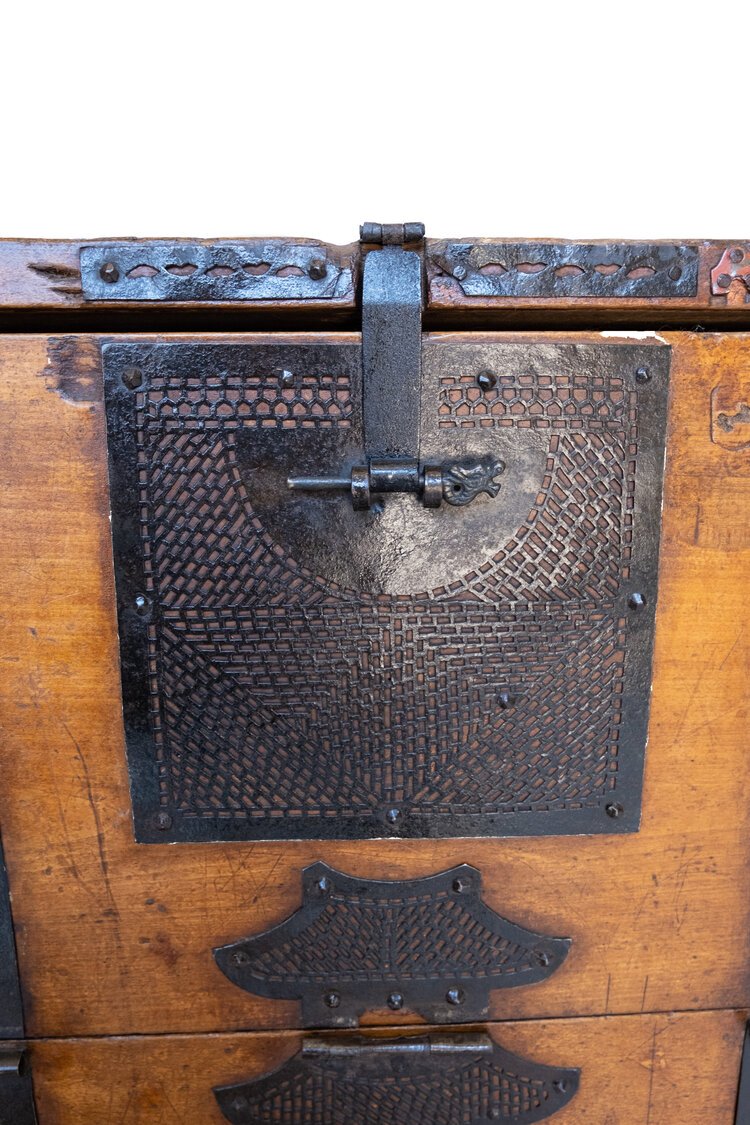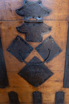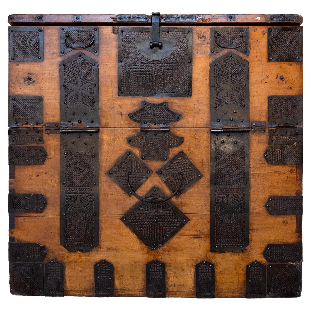 Vintage Korean garment chests constructed of light honey-colored wood with metal filigree designs, each with two hinged door compartments. The metalwork and wood are beautifully patinated.