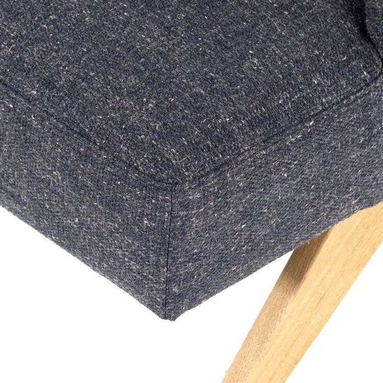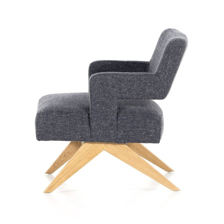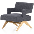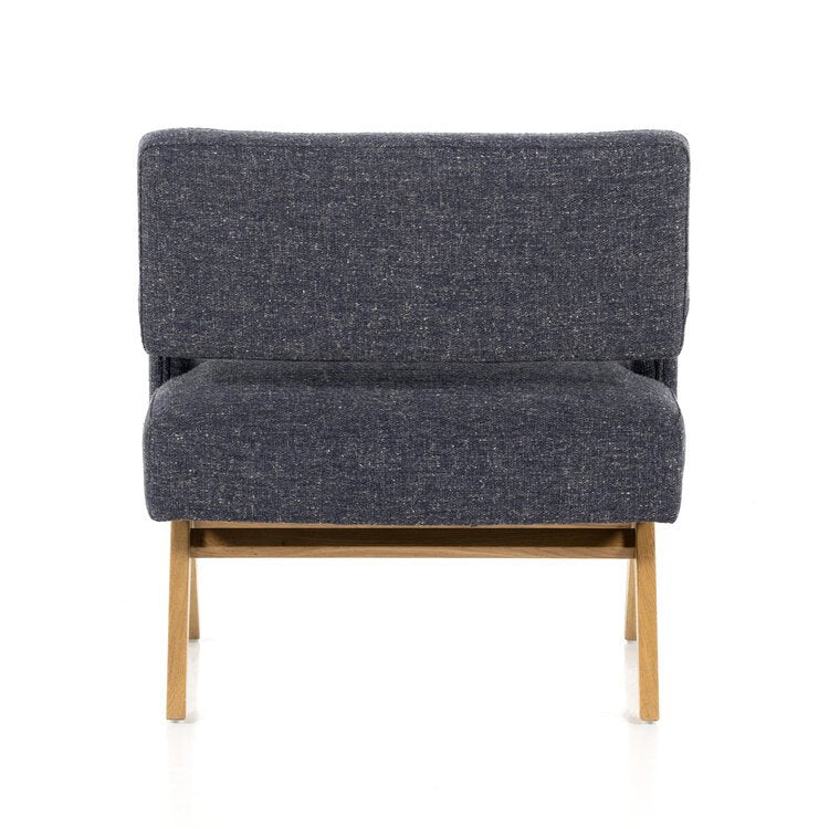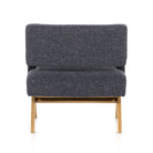 A celebration of negative space. Light, honey-finished solid oak forms an angular A-frame for structured seating upholstered in heavily textured high-performance fabric. The result is awe-inspiring from all angles.