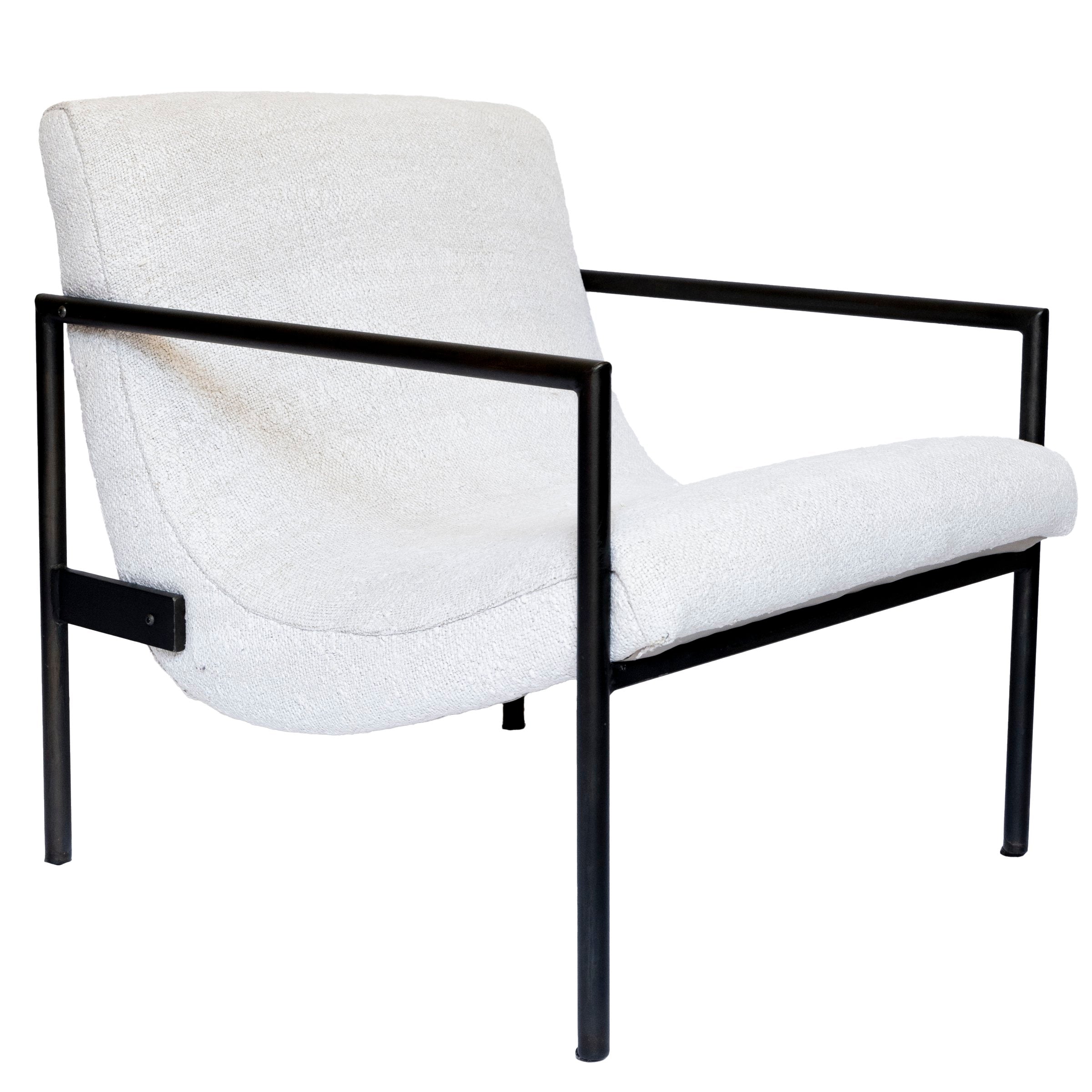The Geneva Lounge Chair adds a contemporary touch to your interior. Its metal frame and curved back, combined with a supportive seat, merge comfort with this otherwise edgy frame. This pair of chairs are custom upholstered in a one-of-a-kind heavy textured hemp rug.