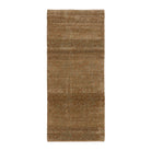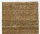 Tibetan area rug in golden brown with a wandering scroll pattern.