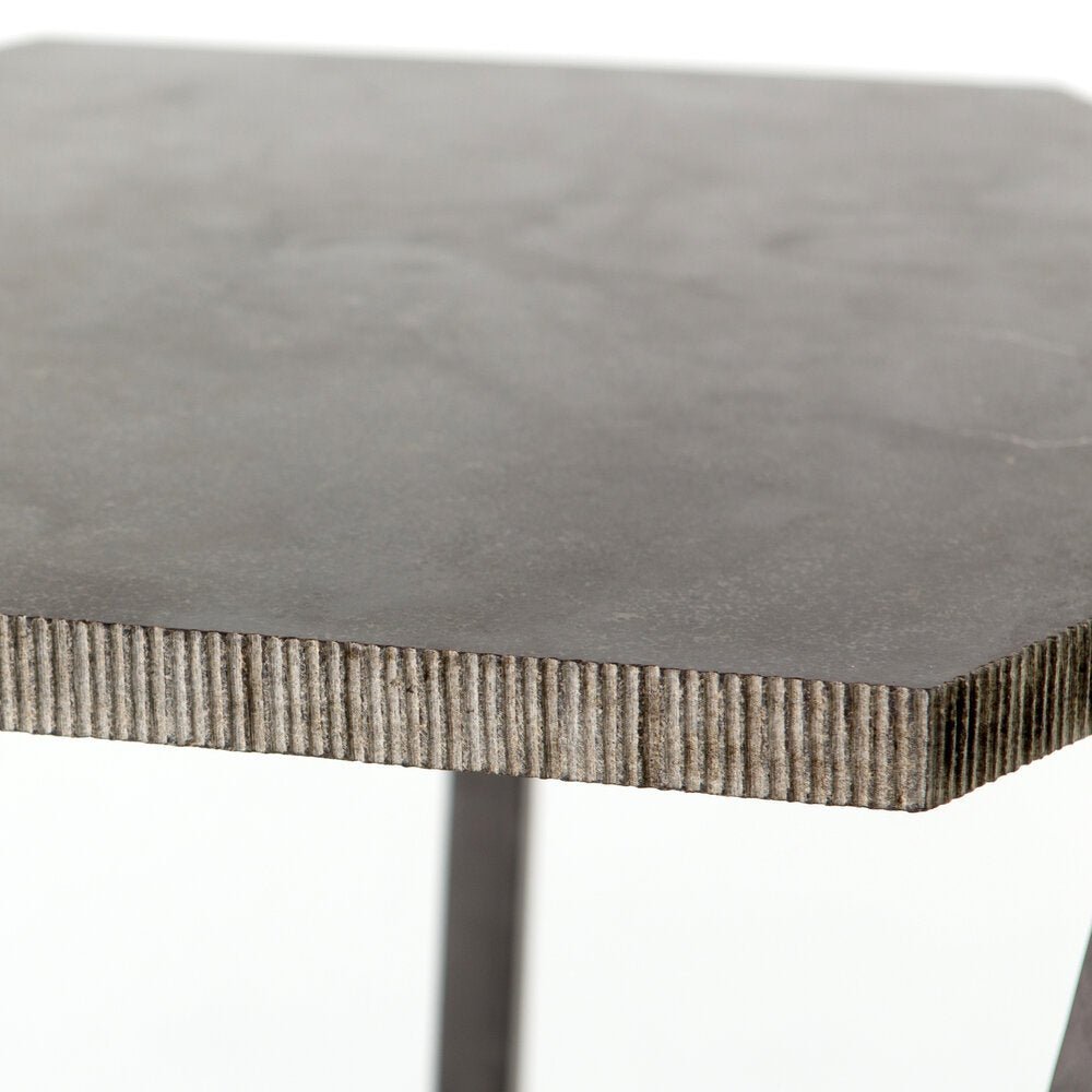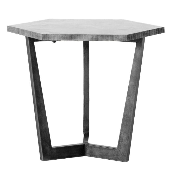Cutting-edge style. A slim, mottled iron base meets a hexagonal bluestone top, creating a geometric look inspired by Brutalist architecture. A raw, rustic vibe adds weight to an open-air frame.