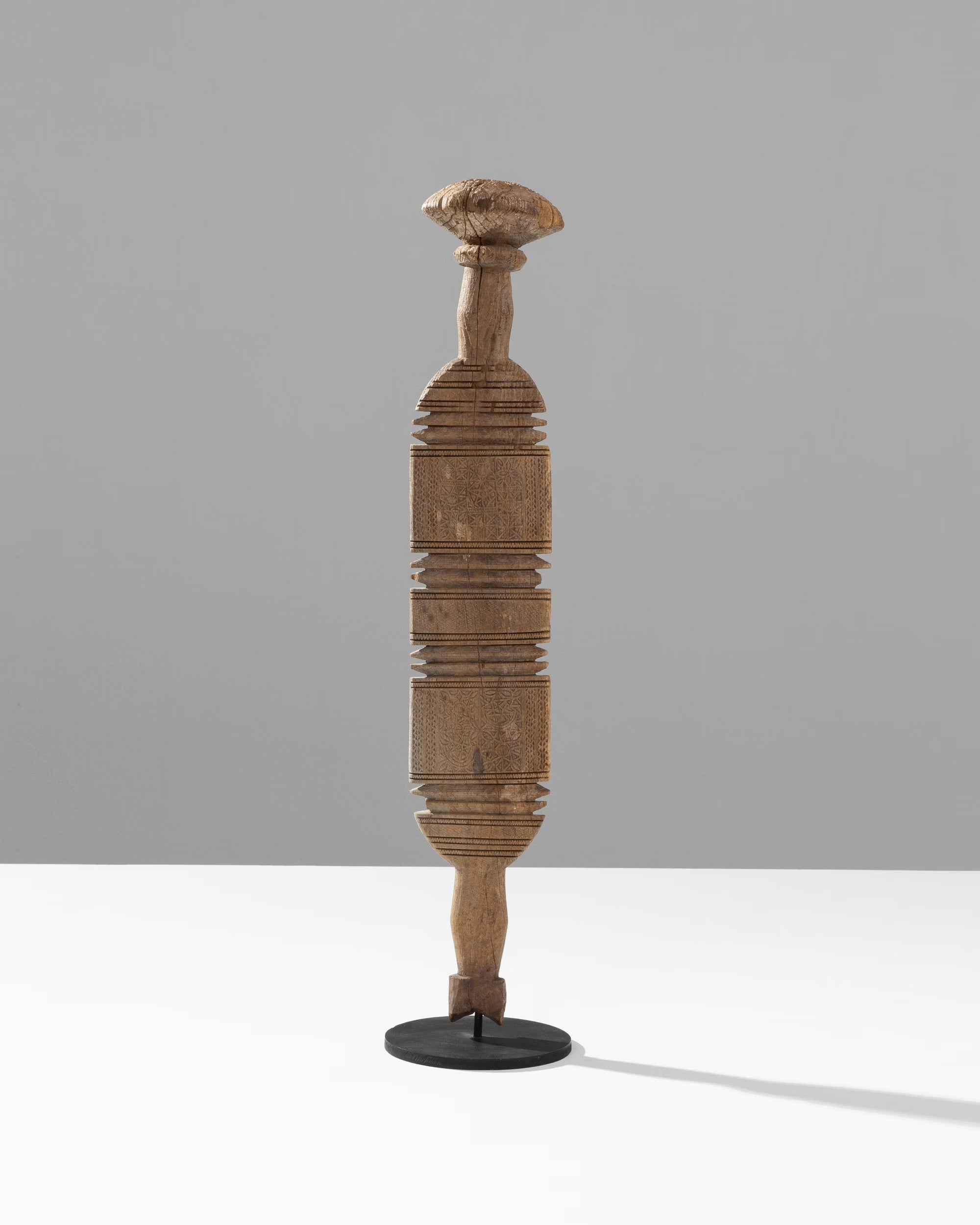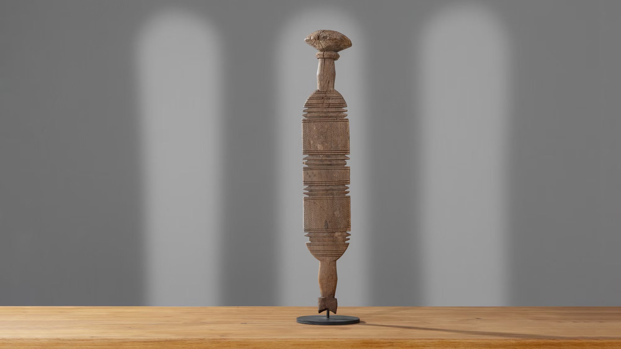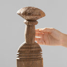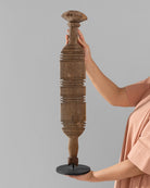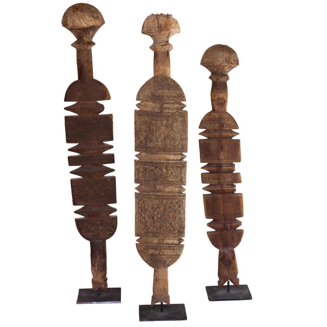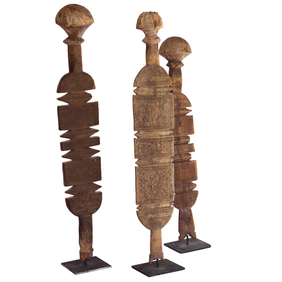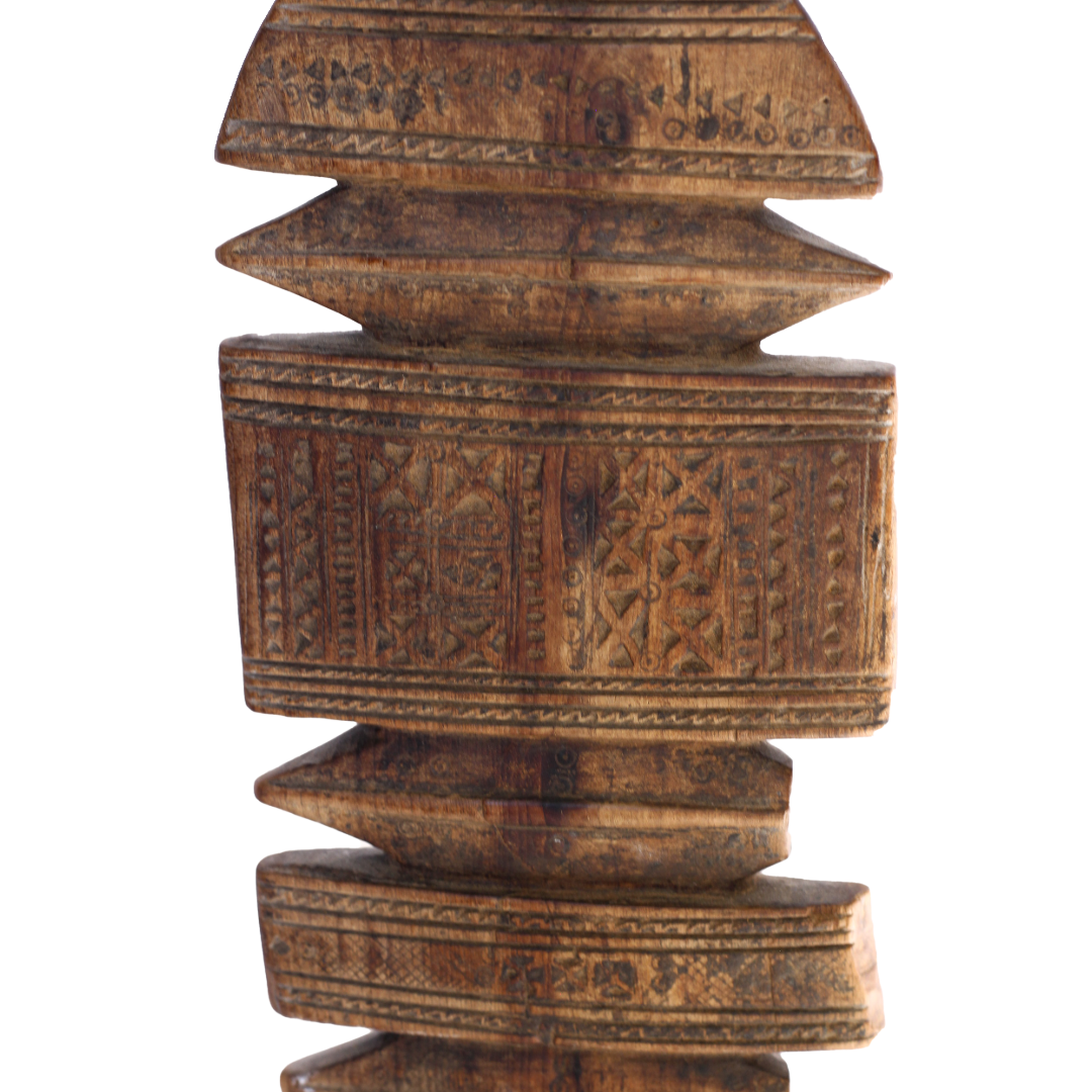 Handcrafted by the nomadic Tuareg people of North Africa, these authentic vintage tent posts were essential for supporting desert dwellings. Carved from durable Jdari wood, they feature intricate tribal motifs. The forked top secured crossbeams, while the rounded base prevented sinking into the sand, showcasing Tuareg ingenuity. A one-of-a-kind piece of history, it embodies the craftsmanship and traditions of a resilient culture.