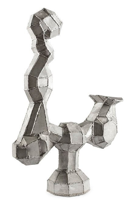 Aluminum. Circa 1980s. It is signed on one of the panels of the piece. Welding aluminum is difficult so the artist who made this piece is an expert welder. The back story: Found in an artist’s studio, the sculpture had been traded for a painting.