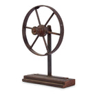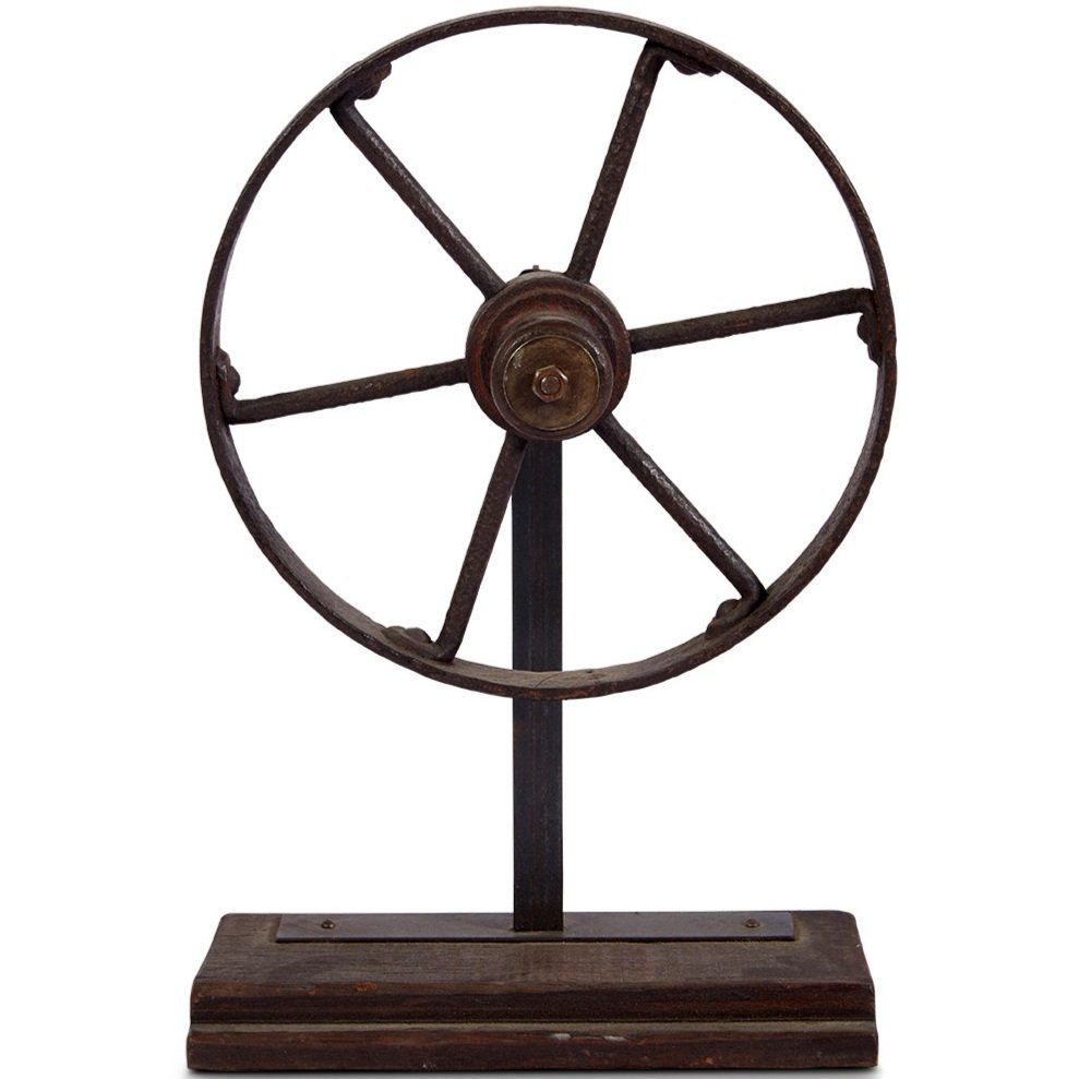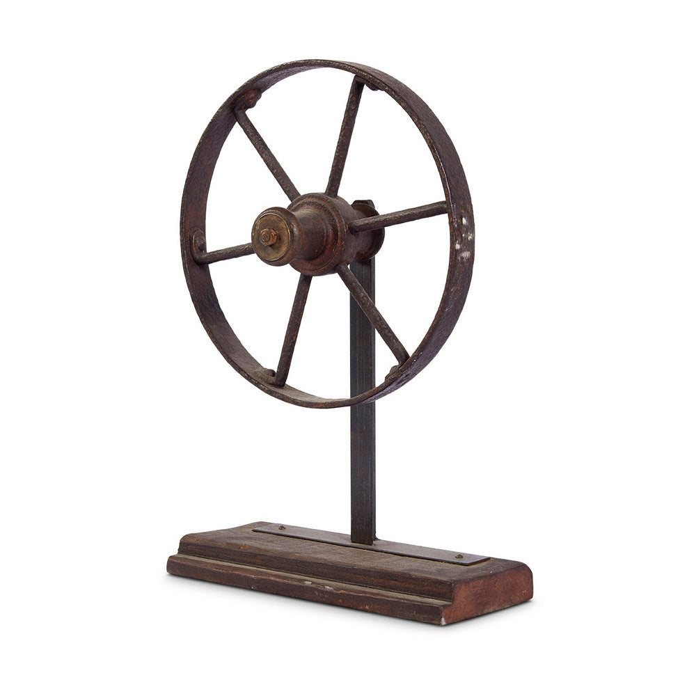 Vintage industrial metal clothesline pulley wheel mounted on a wood base. There are two of these sculptural objects in stock, they work well paired together or stand alone on a shelf or console table.