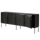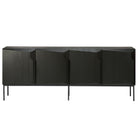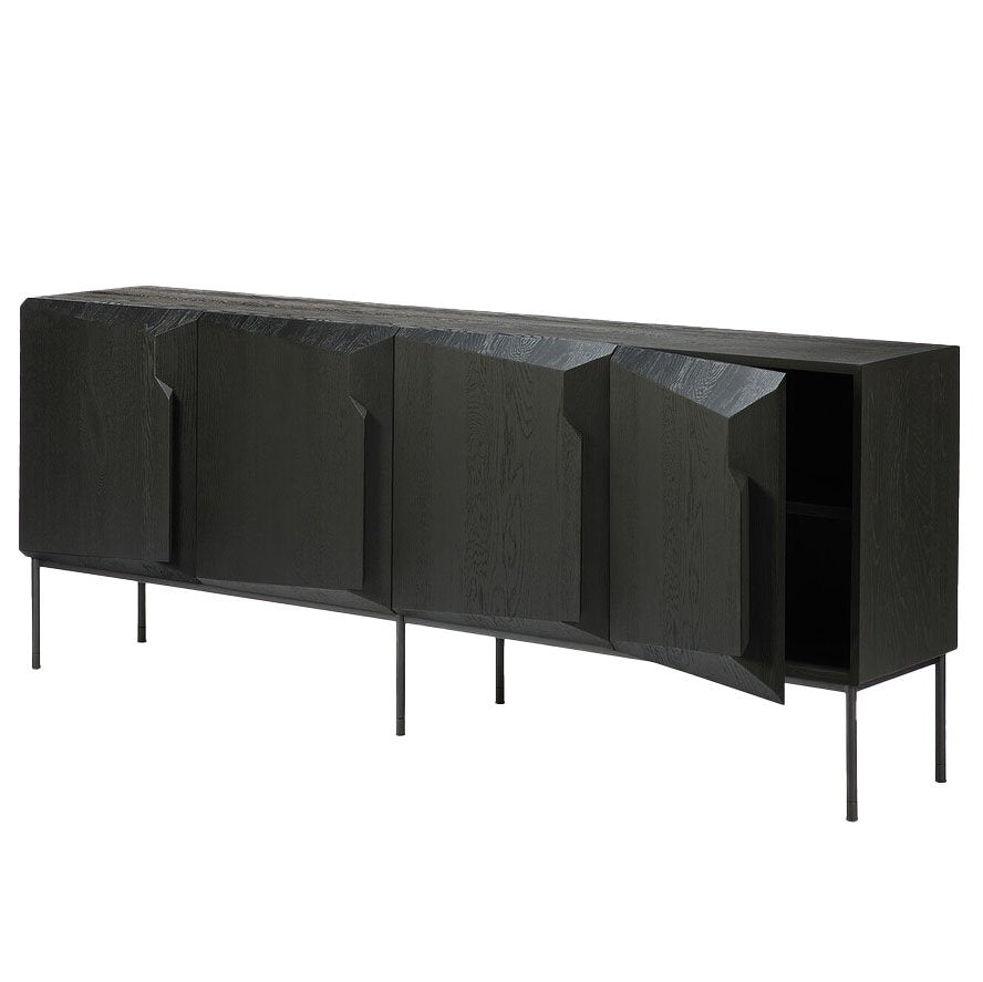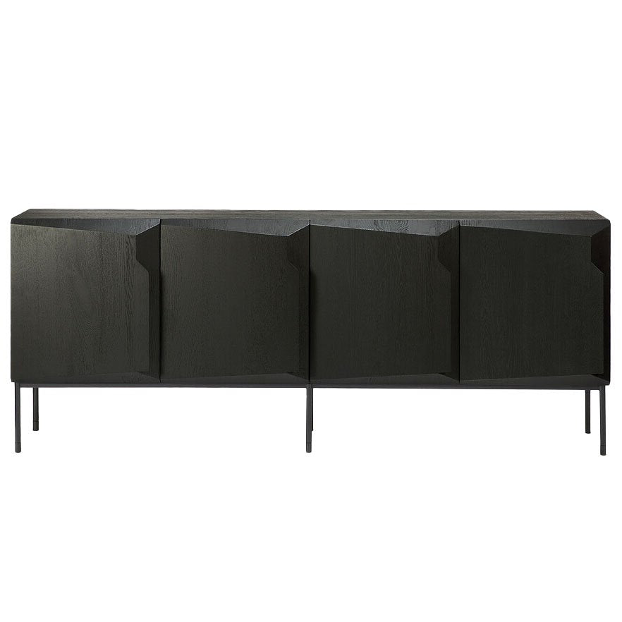 An angular graphic composition forms a unique sense of volume and style with this modern storage sideboard made from black tainted solid oak with a varnish finish and black metal legs. Each of the four doors shelters an adjustable shelf providing ample storage space.