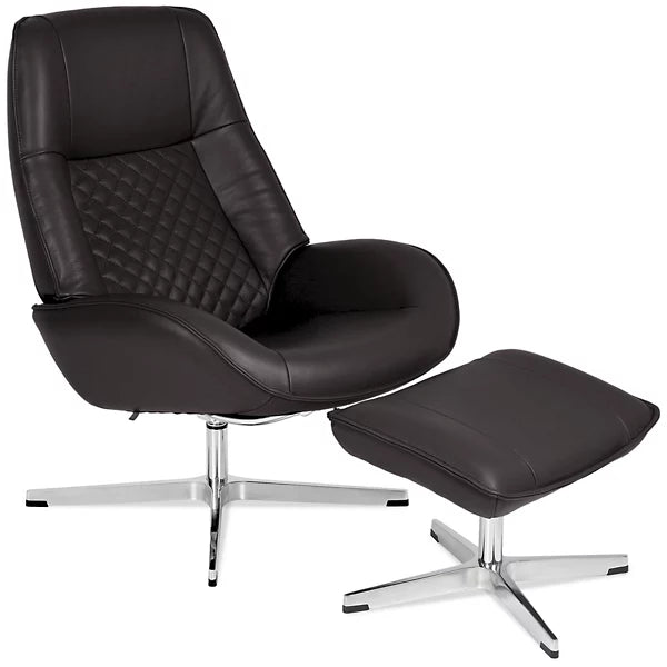 A form-hugging addition to your lounging needs with a sophisticated aesthetic to match. Seep into the leather-wrapped, foam-filled embrace of the lounge chair. The sleek 4-point base provides rotation and securely anchors the chair to the floor when you lean back. The included ottoman supports your lower body for top-to-bottom relaxation while maintaining its shape.