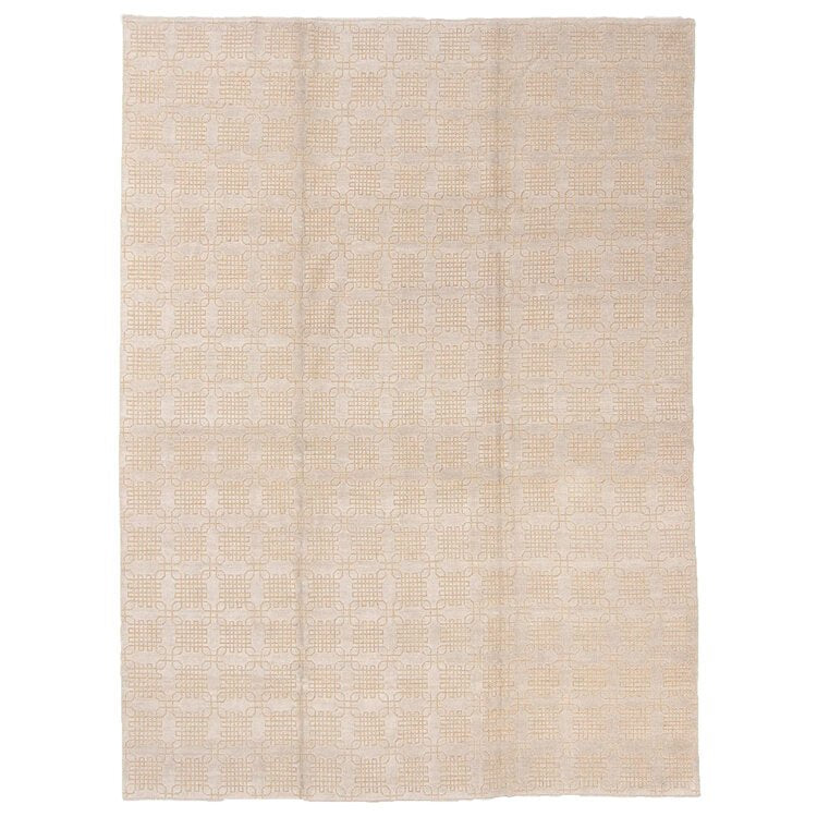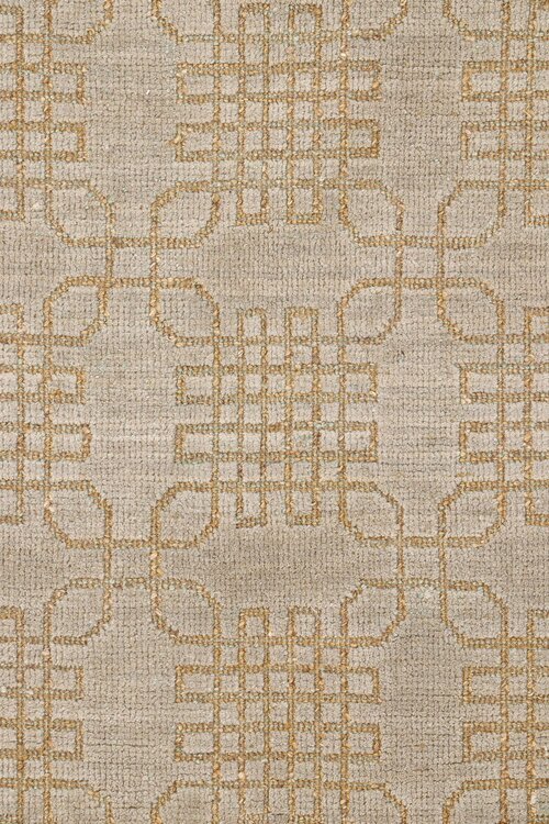 Modernist Tibetan area rug hand woven in Nepal with golden color wool. The rug features an interlocking geometric pattern in a darker golden color.