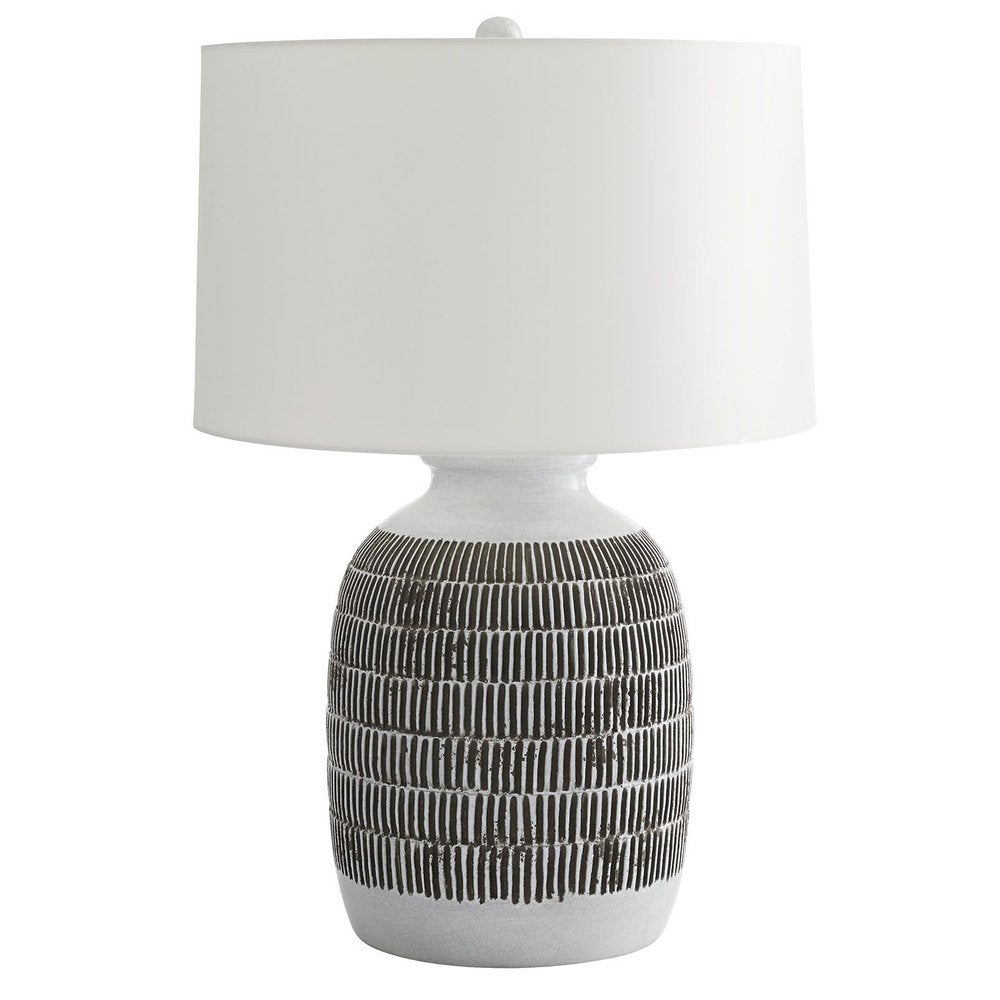 A rich texture is exhibited on this large-scale terra cotta lamp, created by the hands of skilled artisans. After the form is shaped, the terracotta is combed to create a tribal-inspired etched pattern. The carolina blue glaze adds to the textural contrast and has a slight crackling where the etchings are absent. Topped with an off-white microfiber shade with an off-white cotton shade and a matching terracotta finial.