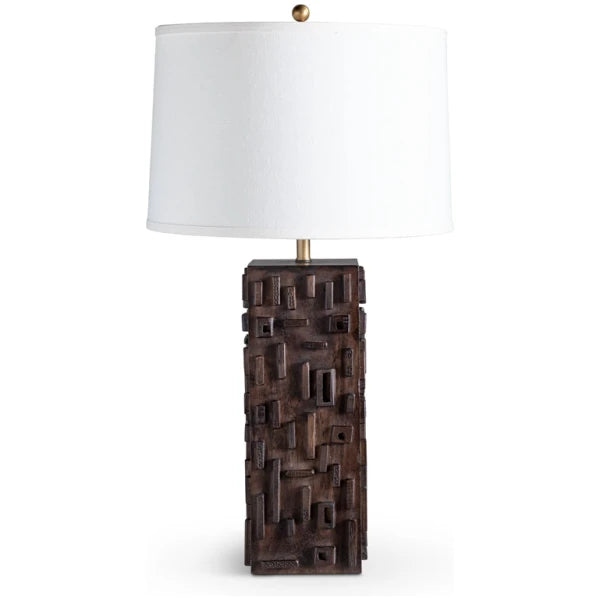 A bold mid-century brutalist design, the hand-carved wood base has strong, faceted lines and a warm espresso stain that brings out its natural grain. Finished with a crisp linen drum shade, it delivers sculptural character and a soft, inviting glow.