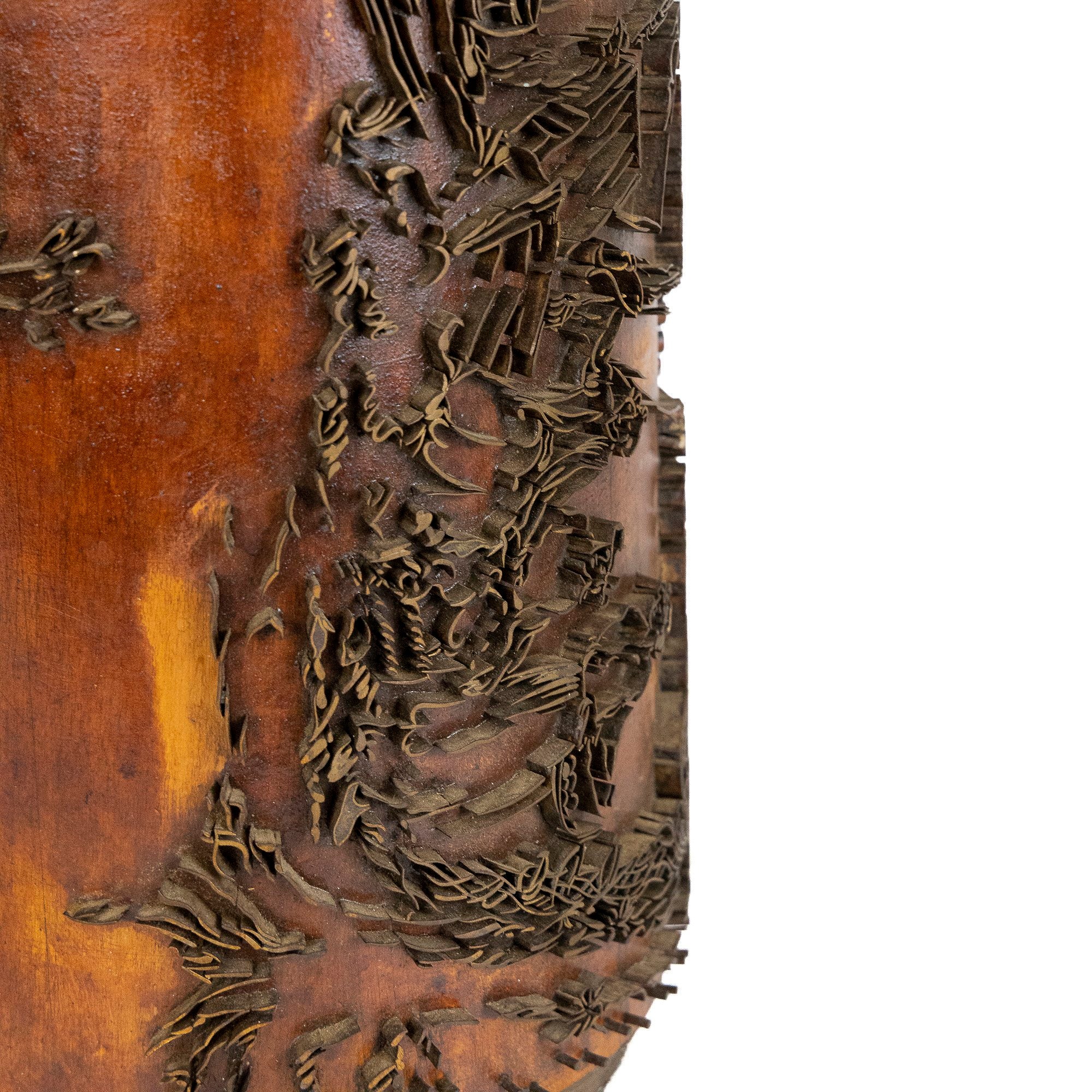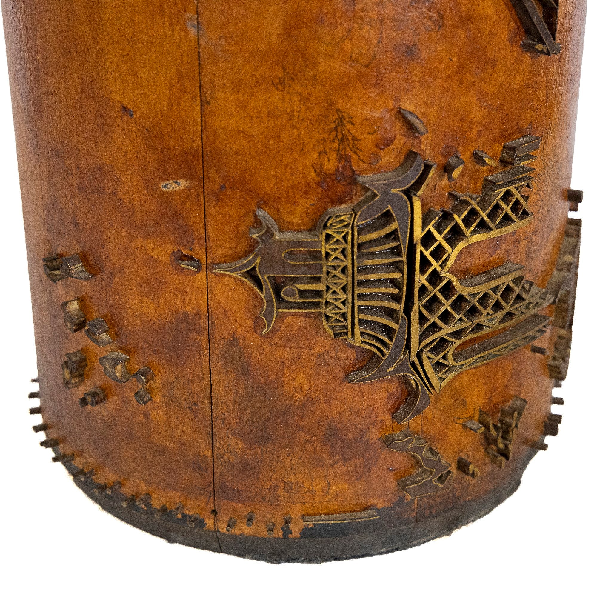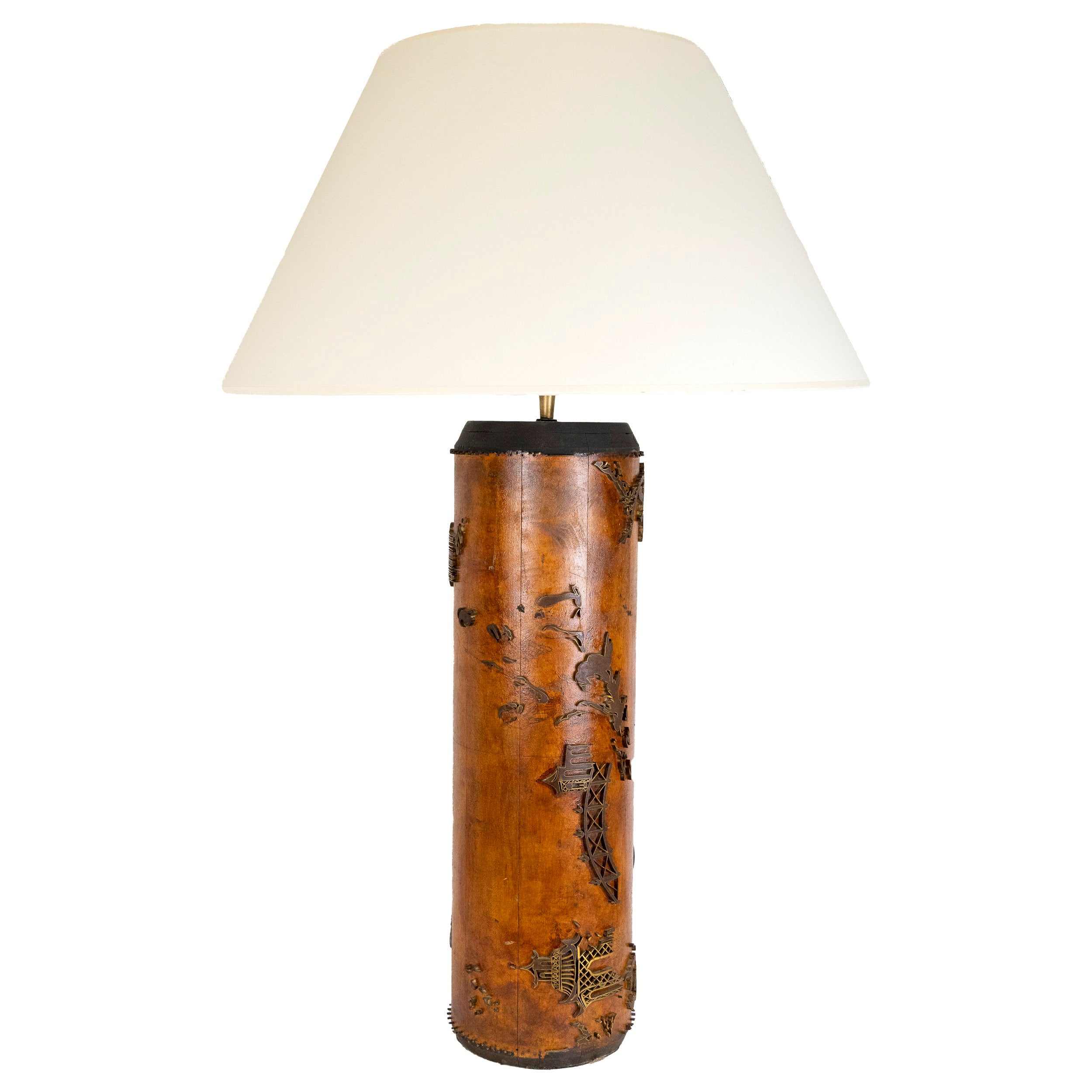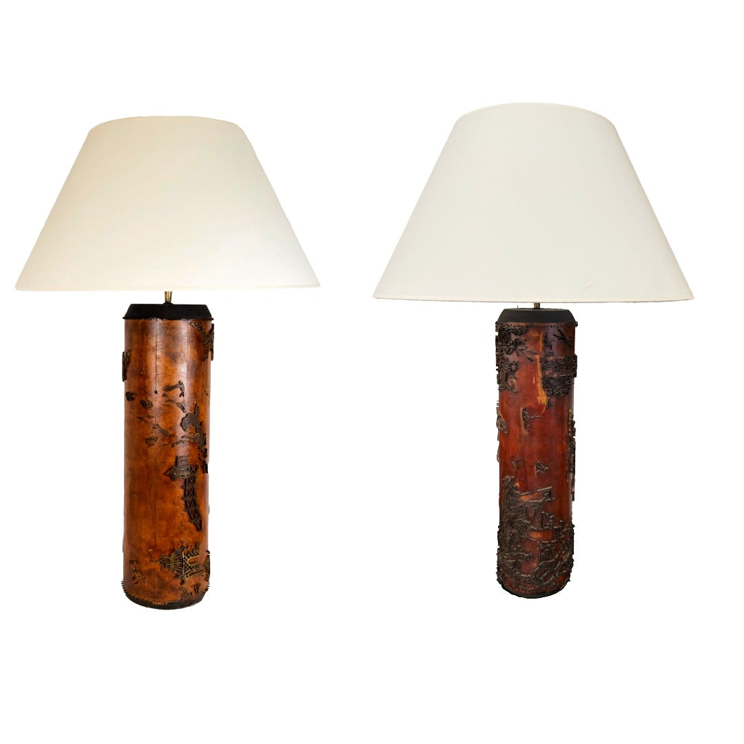 Pair of Vintage French Wallpaper Printing Roller Table Lamps, circa 1960. The tall wooden roller is covered with brass relief Chinoiserie scenes. Once used to roll prints on wallpaper, this unique pair of lamps embody a distinctive craft tool reimagining. New wiring and linen shades.