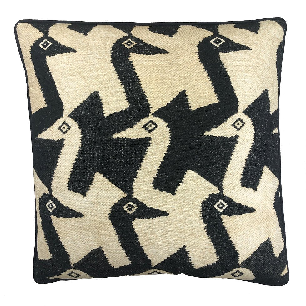 This simple yet charming throw pillow complements both vibrant and neutral decor. The repeating bird motif is a reductive style pattern, featured in warm beige, complimented by a faded charcoal background.