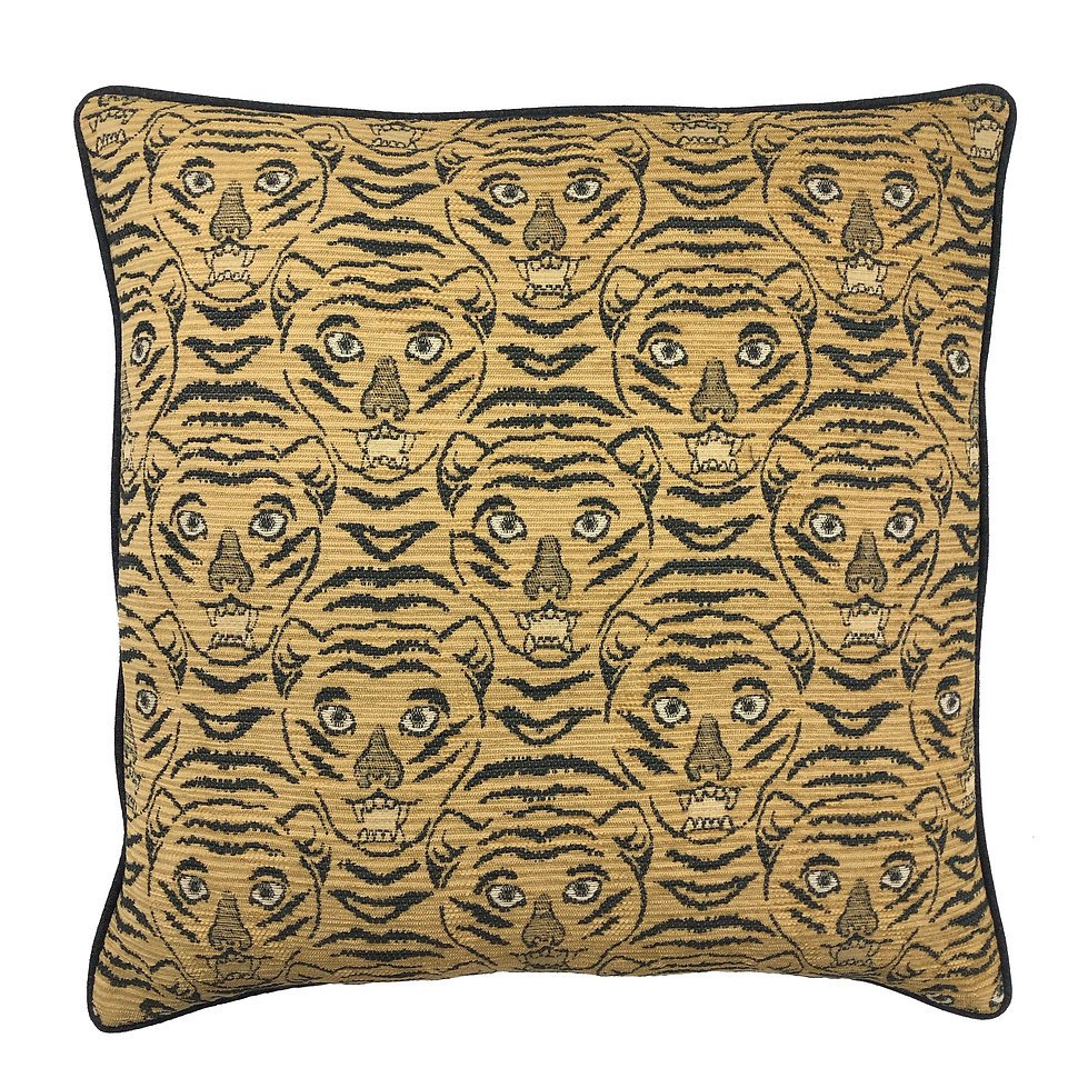Add intrigue and playful elegance to your living room with this repeating tiger throw pillow. Rich golden hues are complimented by the pillow’s black edge and intricate pattern.