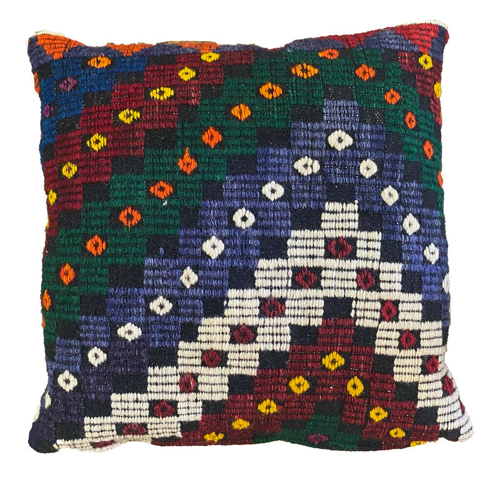 Vintage decorative colorful pillow constructed from a vintage rug with a geometric tribal design.