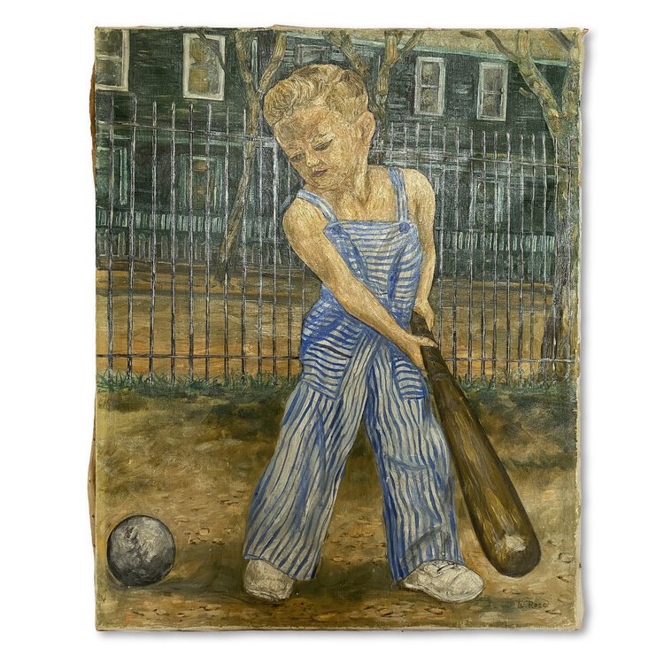 Original vintage American folk art painting. Oil on canvas with detailed texture and expressive brush strokes, depicting a young boy playing baseball. The canvas is on the original stretcher with exposed tacks. Signed by artist W. Rose