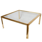 Vintage beveled glass coffee table with polished brass frame. The table sits on a classic simple leg silhouette.
