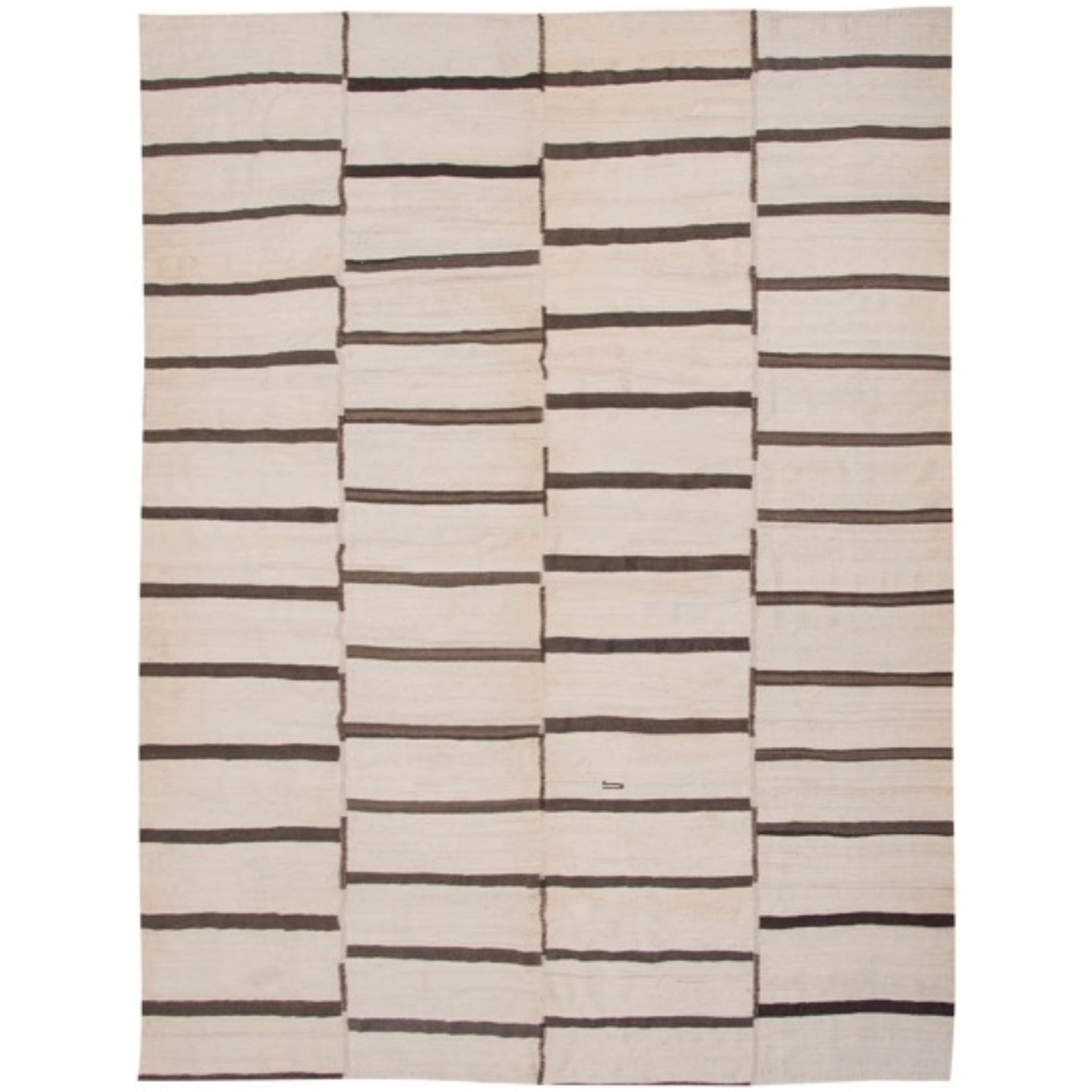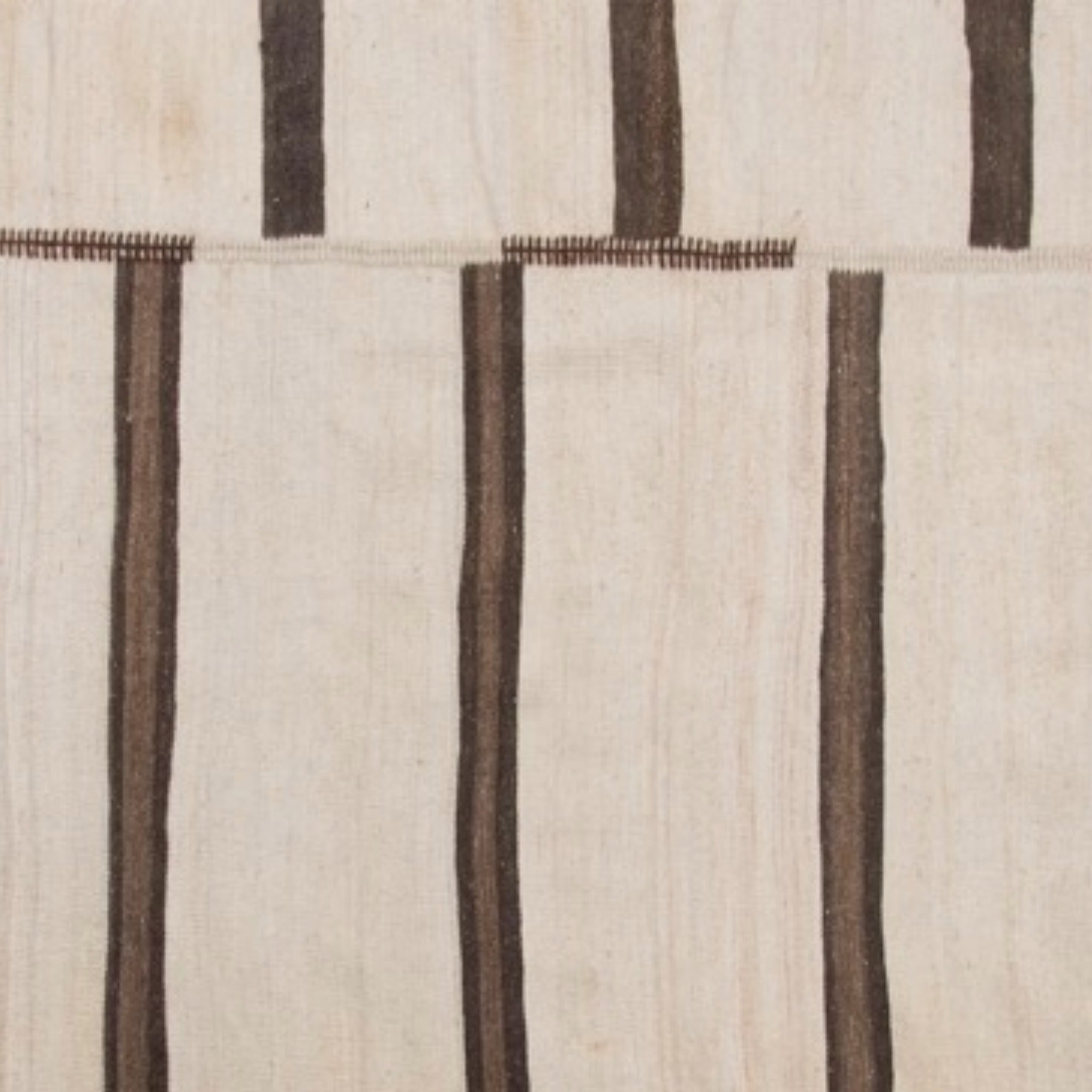 Authentic handwoven Turkish kilim from the 1960s, crafted with 100% wool. Features a minimalist striped design in soft, muted tones and subtle texture. This timeless rug is durable, lightweight, and full of vintage character.