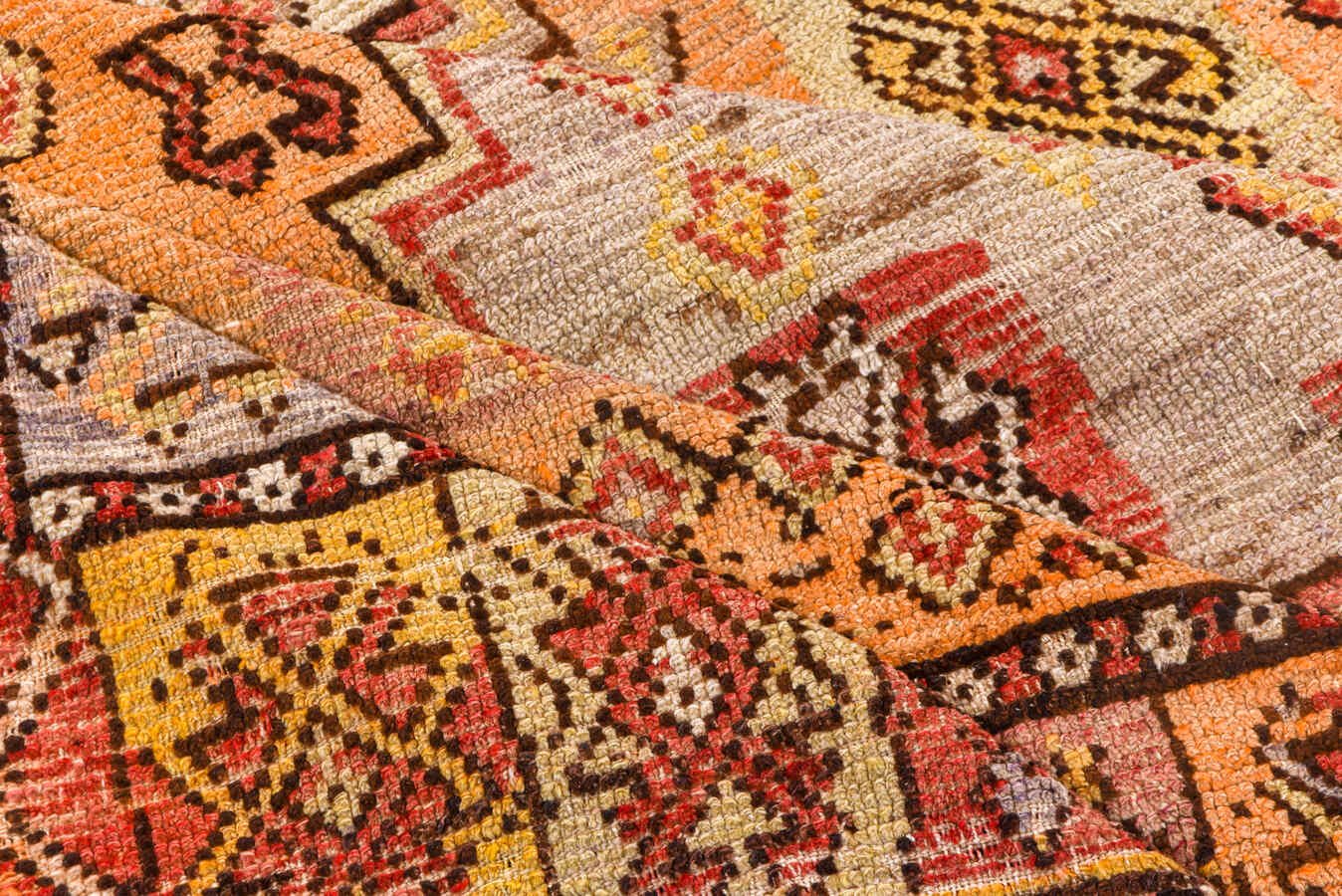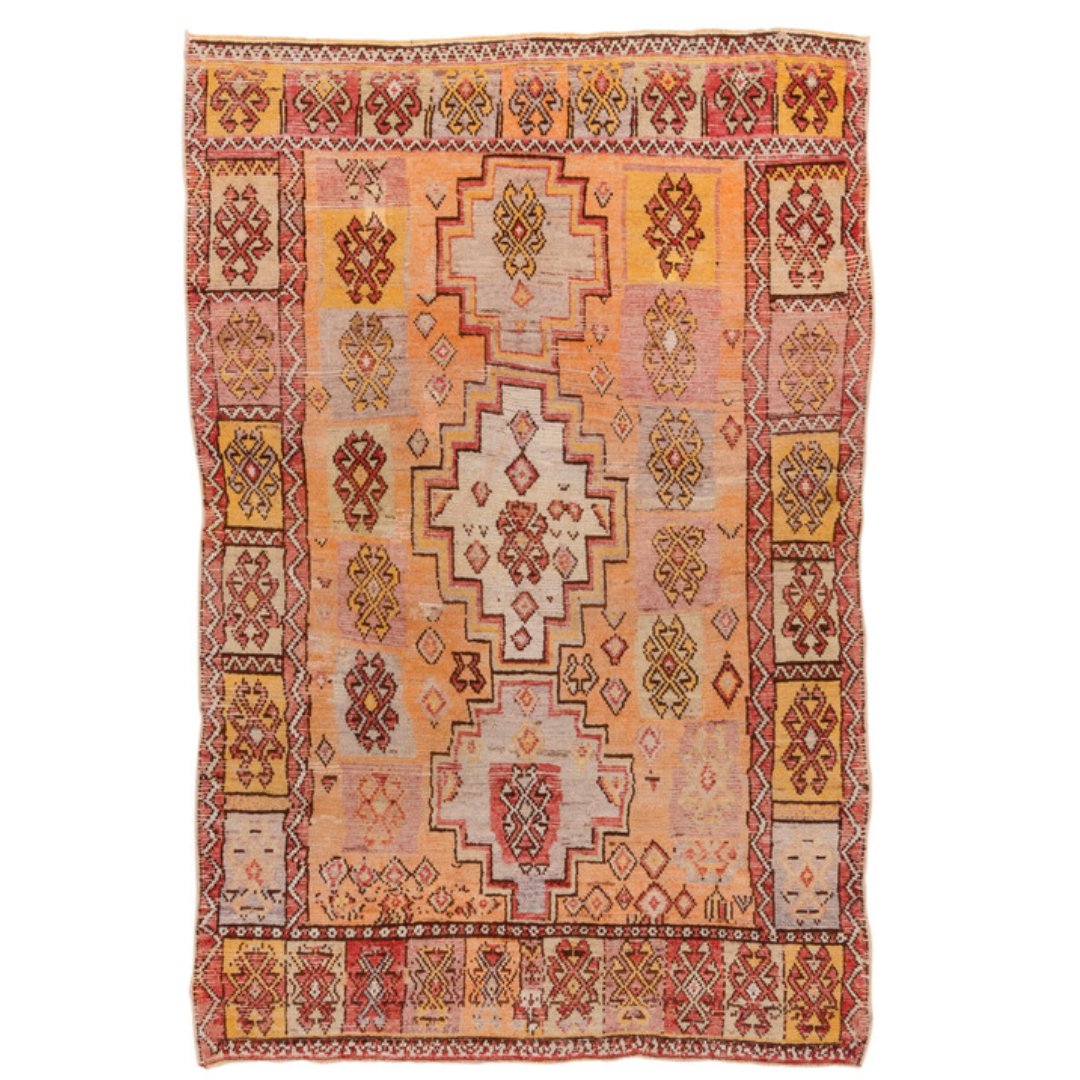 This Vintage Oushak rug features a tribal and geometric design in rich hues of amber, crimson, and rose. The powerful colors and artisanal craft make this a wonderful addition to a modern or traditional interior.