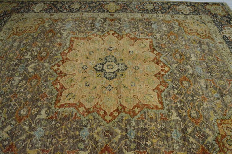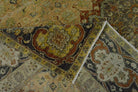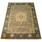 This richly detailed Tabriz area rug features a traditional Persian design with a focal central medallion design surrounded by delicate floral vines. This classical design is balanced with golden brown underlying tones layered with umber, rust and blue details.