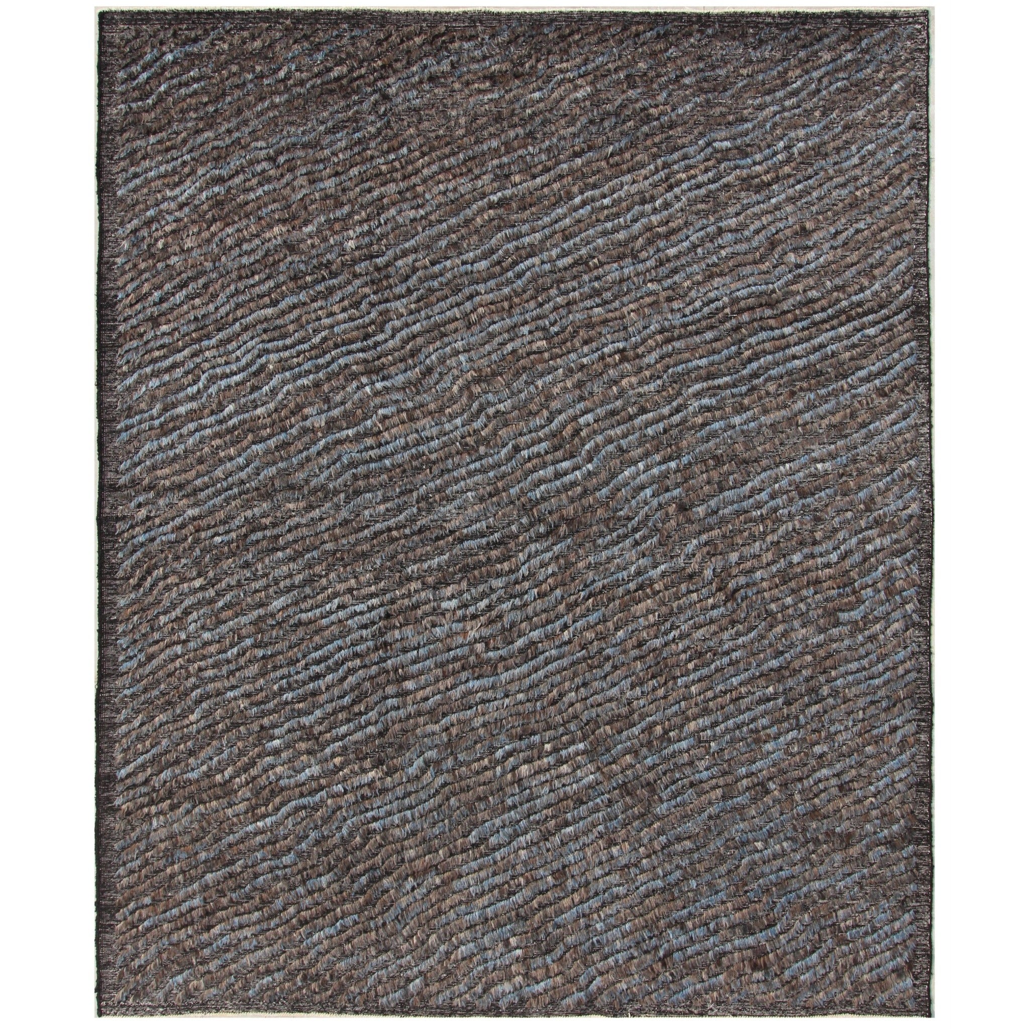 Define your space with this elegant contemporary hand-knotted rug. Crafted from 100% wool with charcoal, fawn, and subtle indigo tones, it offers a rich, organic foundation. The diagonal wave-like pattern is brought to life by the varied pile, creating a dynamic high-low texture that adds visual depth and a pleasing feel underfoot.