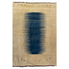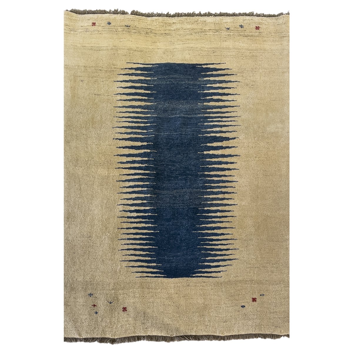 This vintage Gabbeh rug features a minimalist yet striking central motif, a hallmark of tribal Persian weaving. Hand-knotted from rich, hand-spun wool, its thick, plush pile and naturally dyed tones offer both comfort and earthy elegance. The centered design draws the eye and anchors the space, making it ideal for rooms that blend modern simplicity with timeless craftsmanship. A one-of-a-kind piece with subtle charm and bold character.