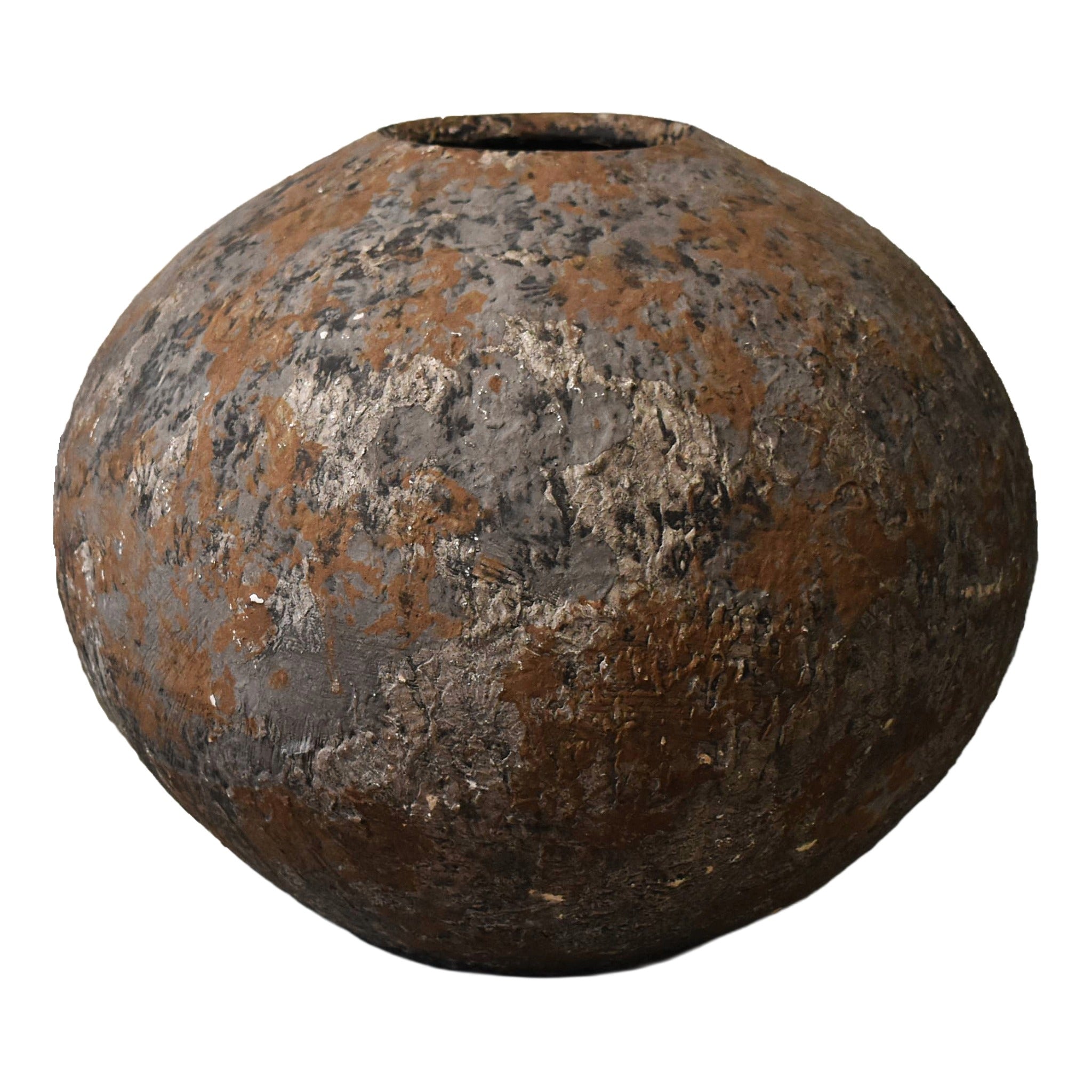 This aged vase has a dense, layered surface with deep brown and ash tones and subtle highlights. The textured finish features natural-looking fissures and raised areas inspired by erosion and weathering. Its solid, sculptural form makes it suitable for both indoor and outdoor use.