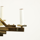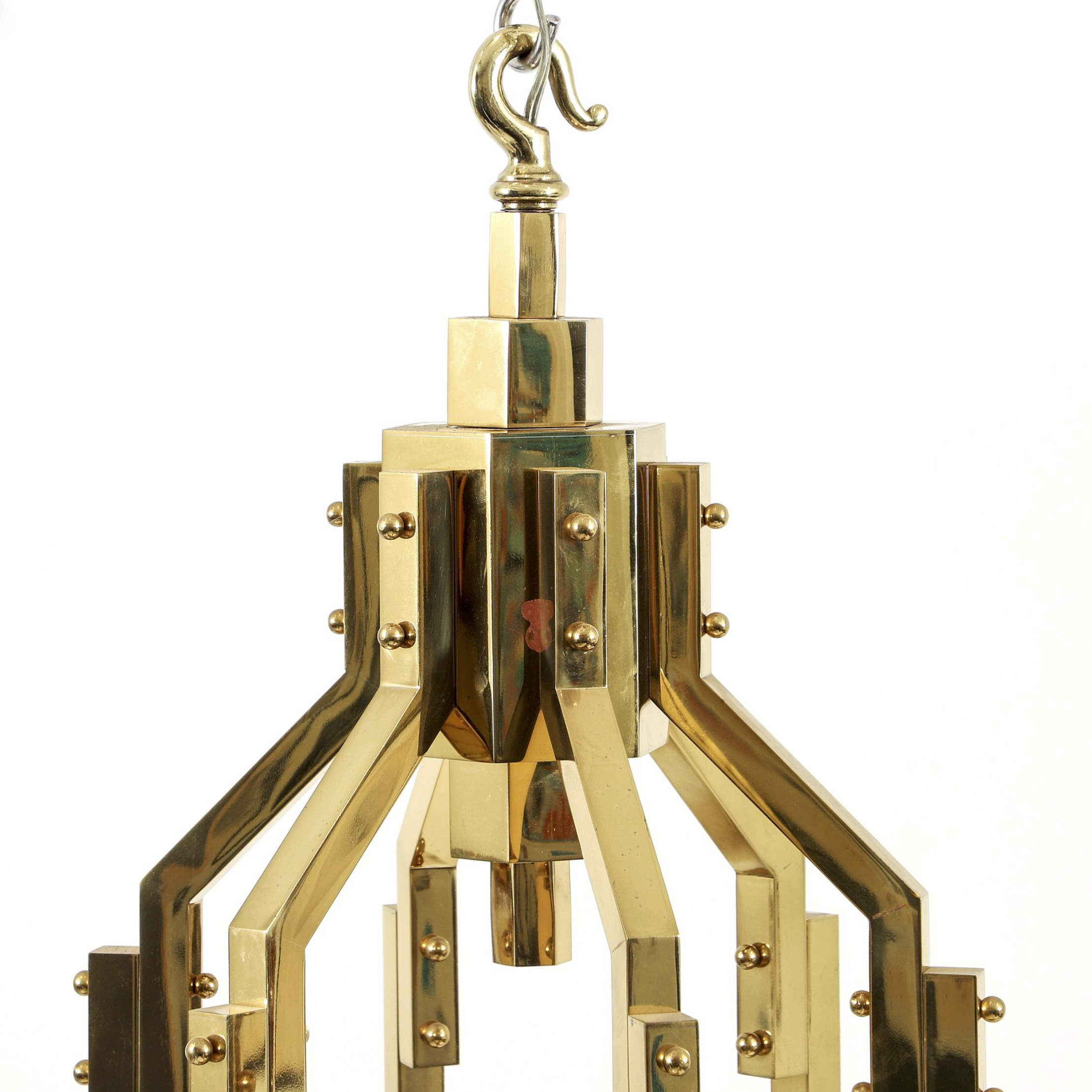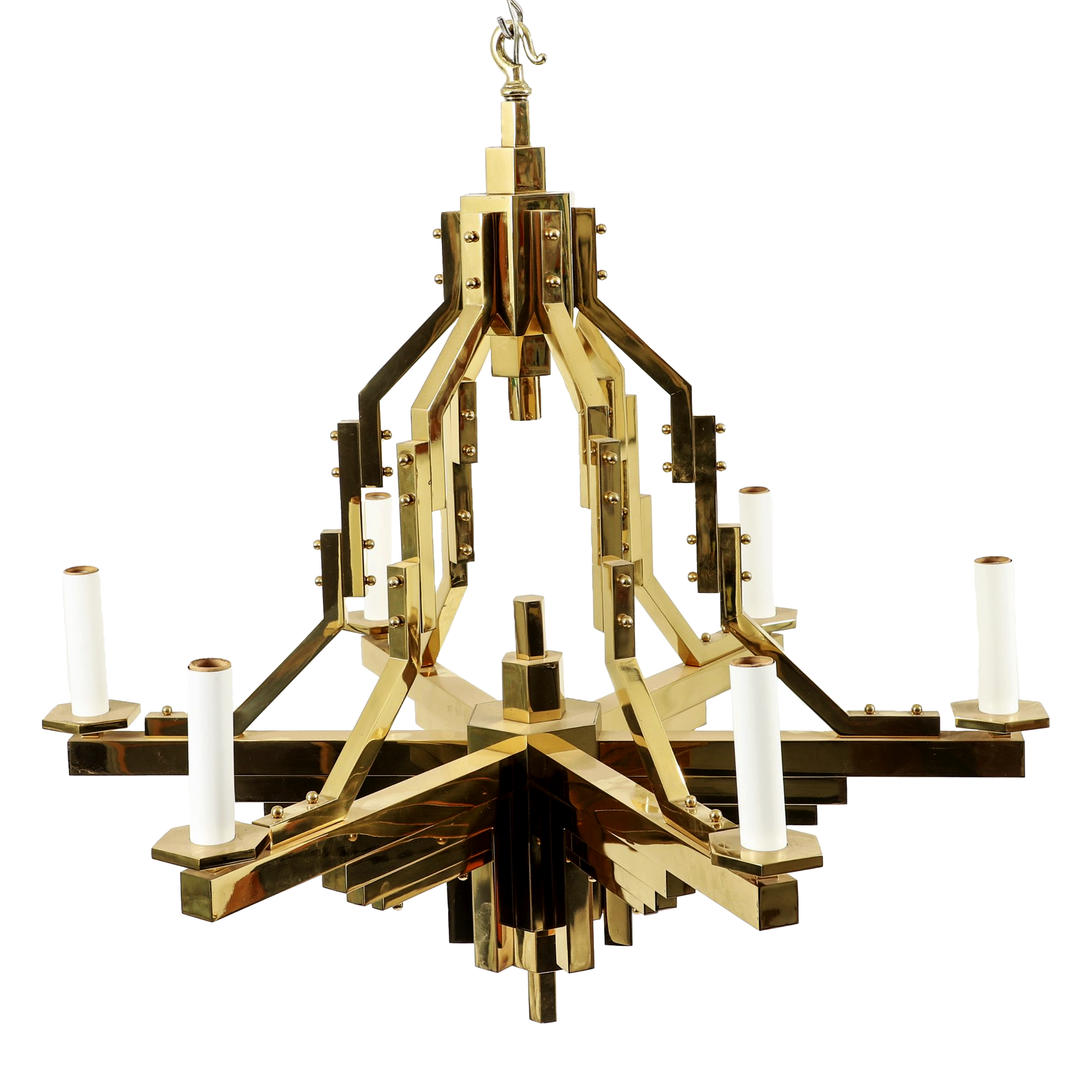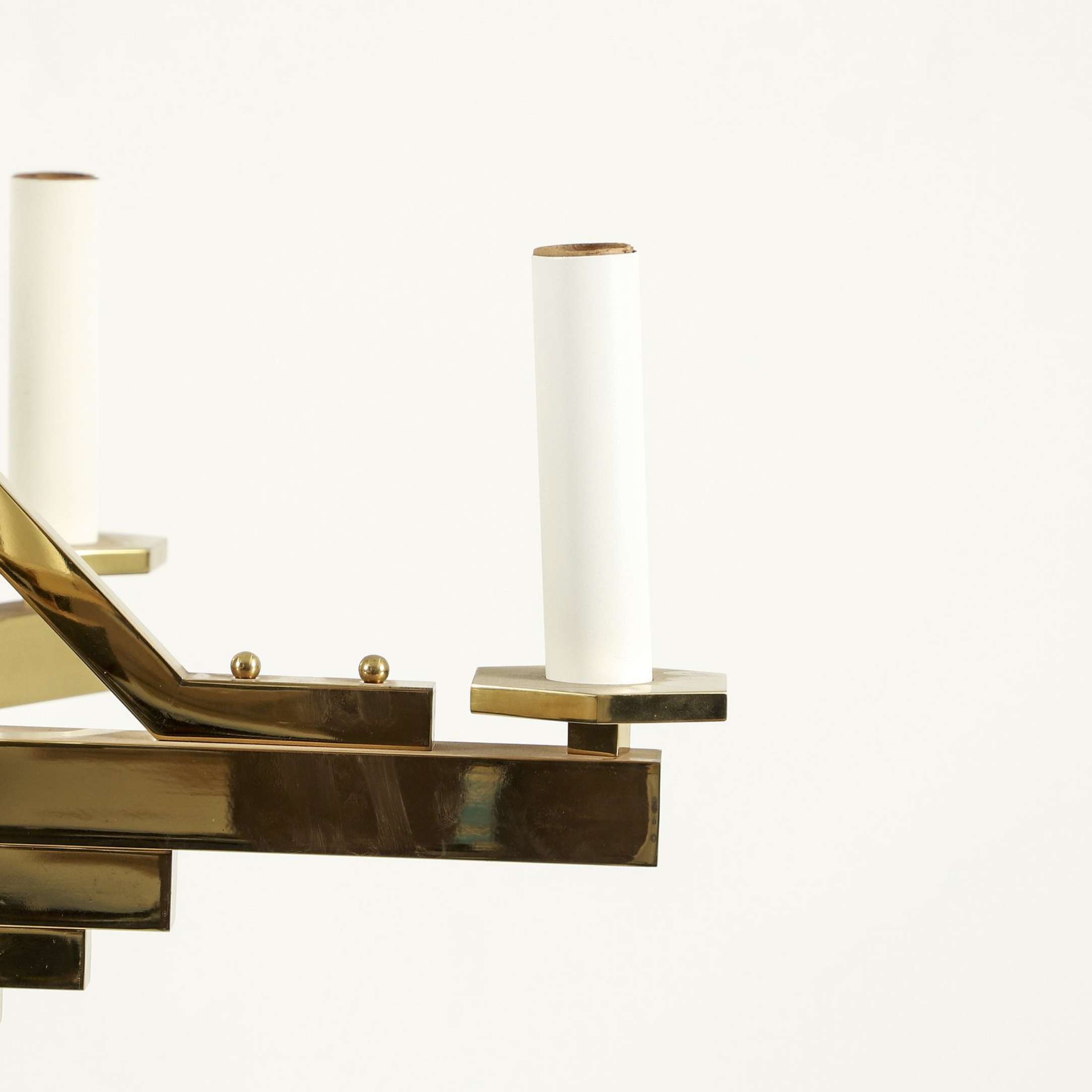 Beautifully constructed Art Deco-style brass chandelier, mid-to late 20th century. Six candle-form lights above hexagonal bobeches, geometric architectural stepped design elements accented with spheres.