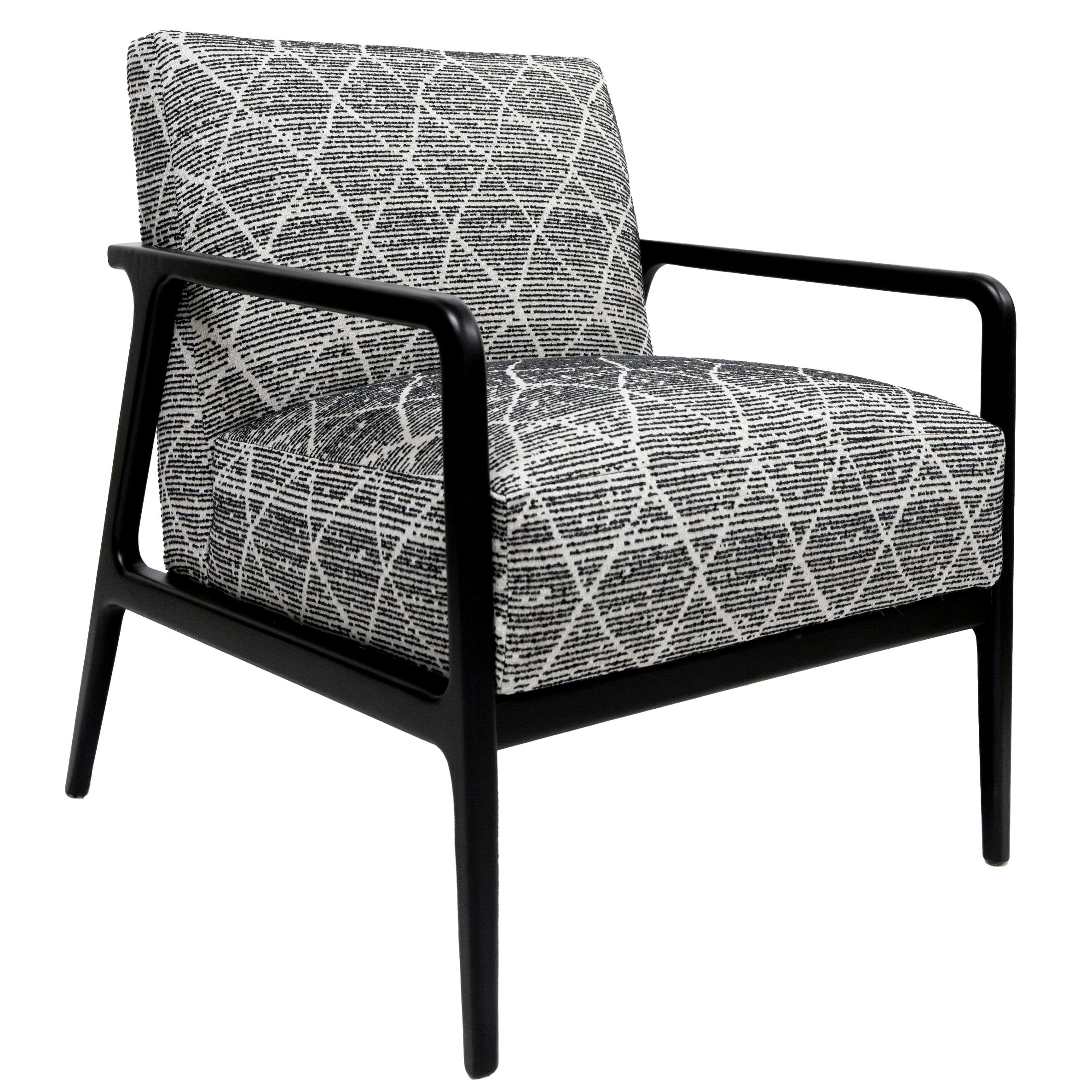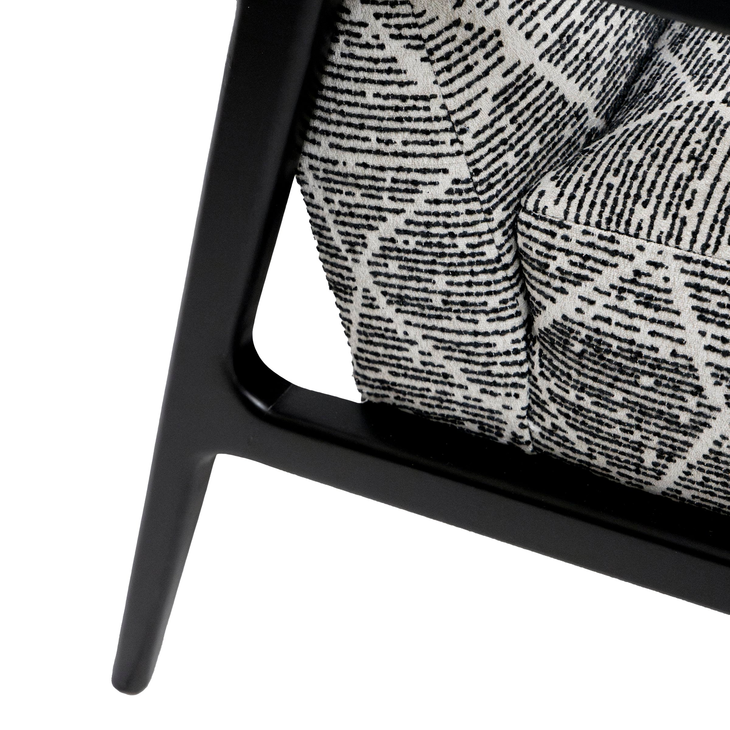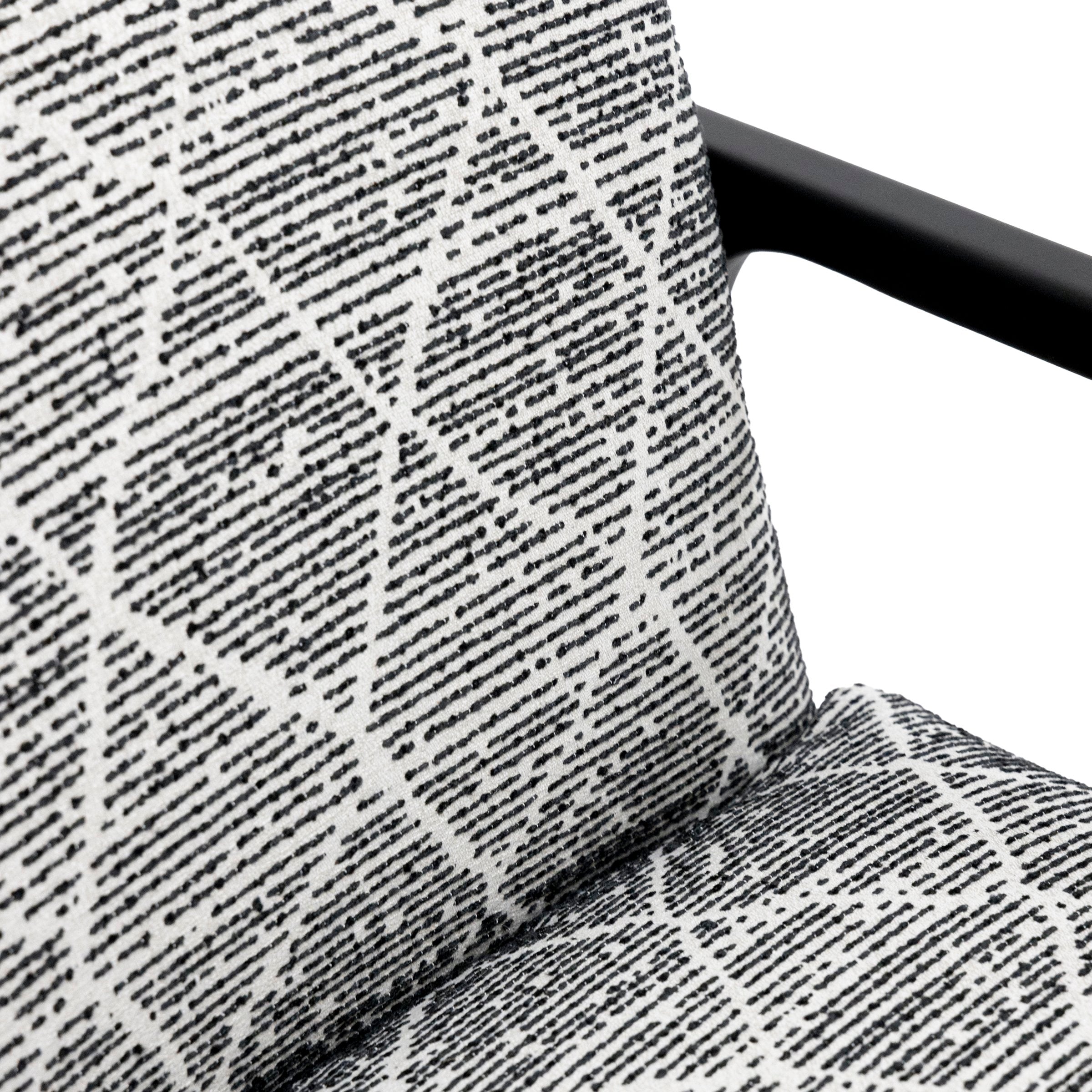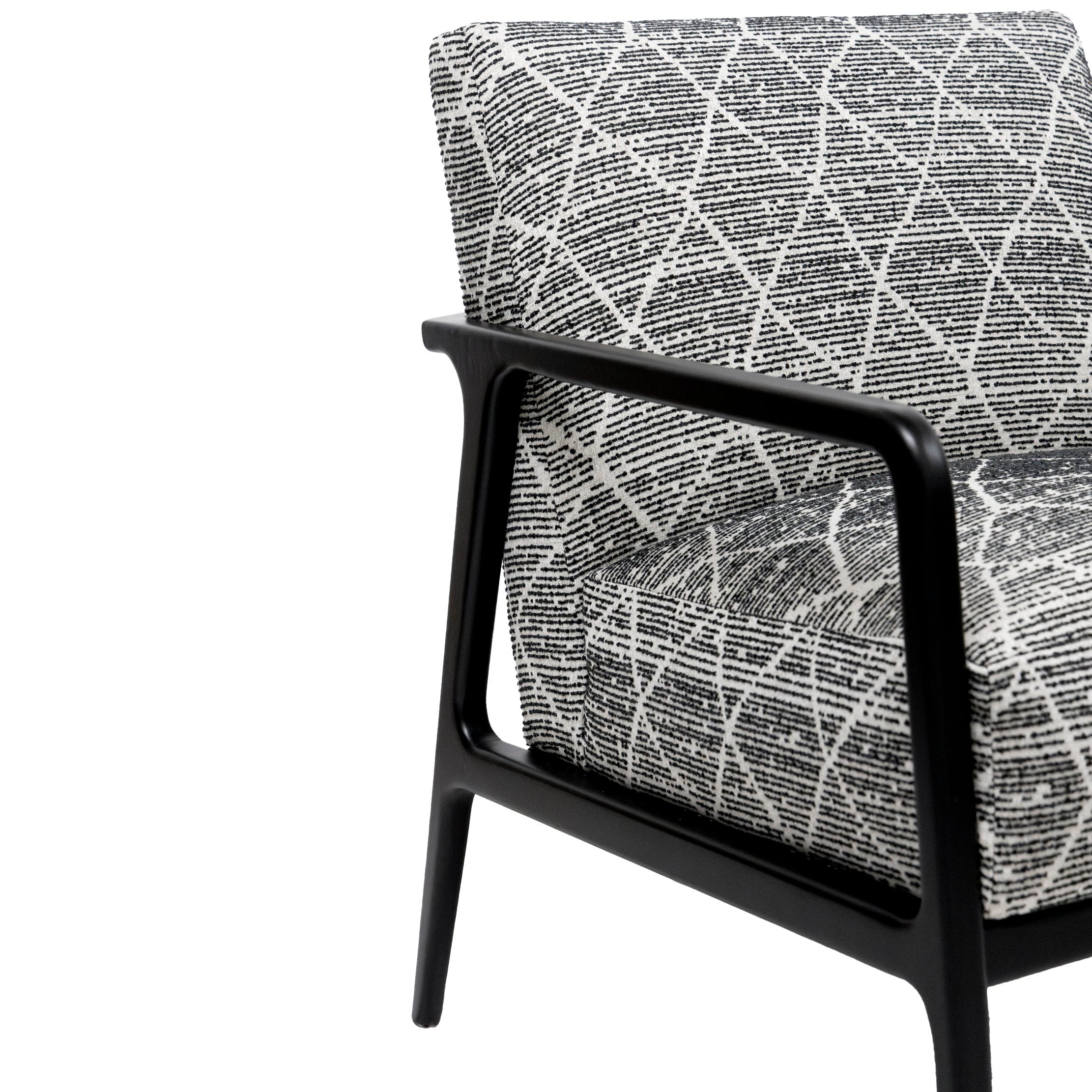The Pumori chair's modern and sleek design, complete with a smooth black wooden frame and rounded edges, makes it ideal for various interior spaces. Upholstered in a black-and-white pattern, characterized by intersecting diagonal lines, it perfectly contrasts with the frame's simplicity. Custom upholstery options are available.